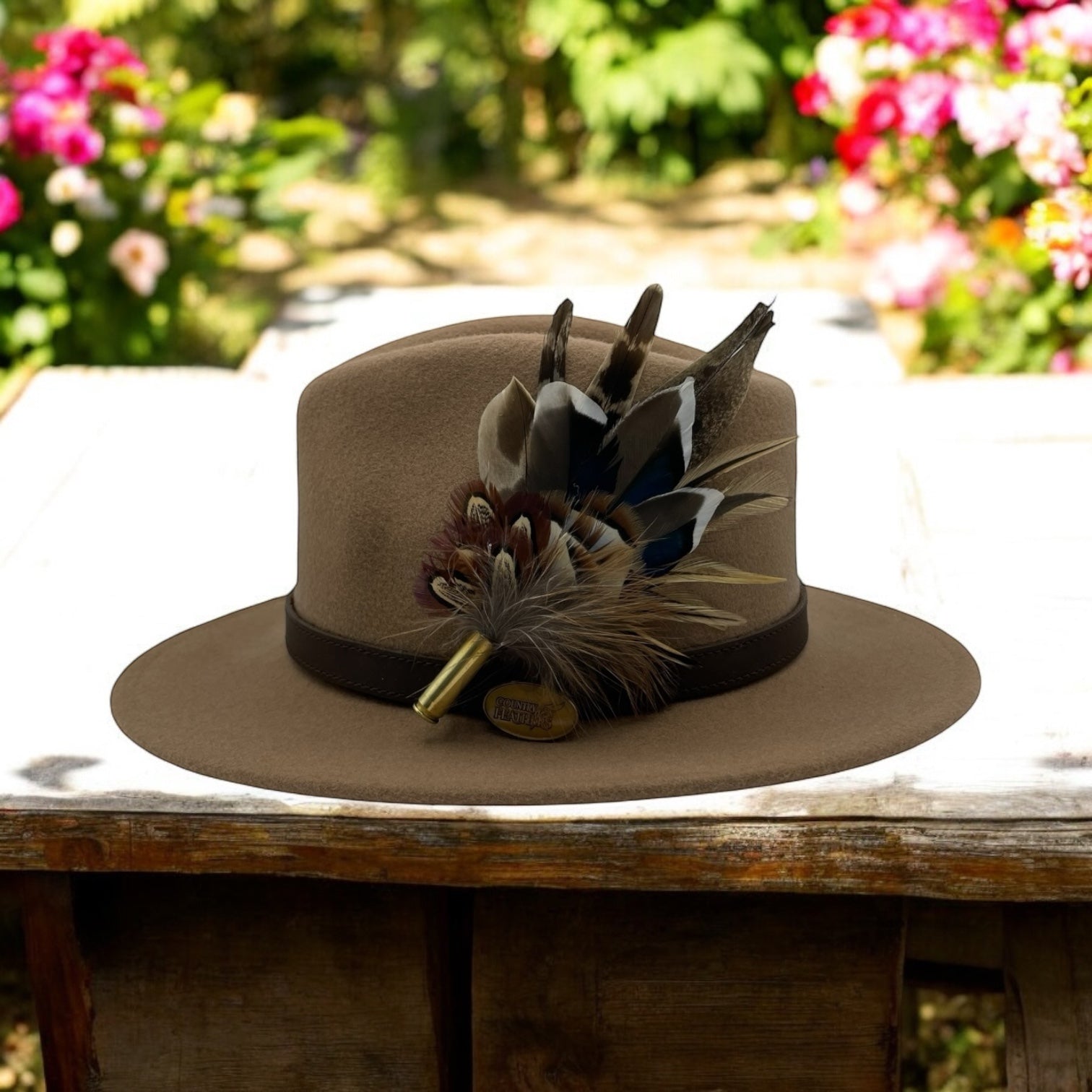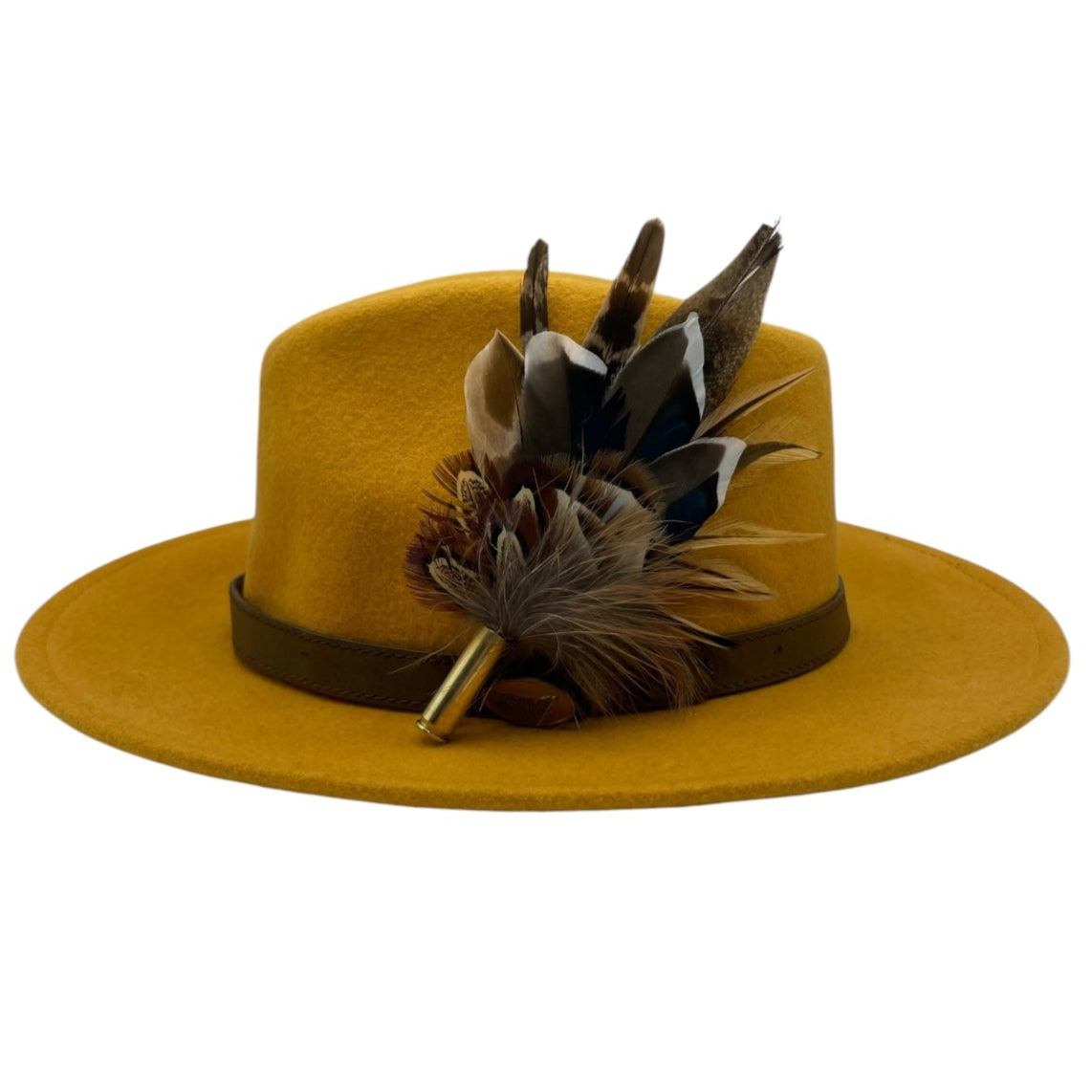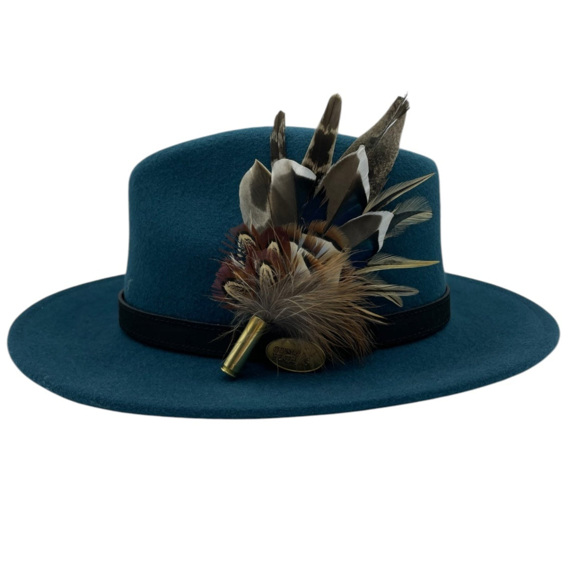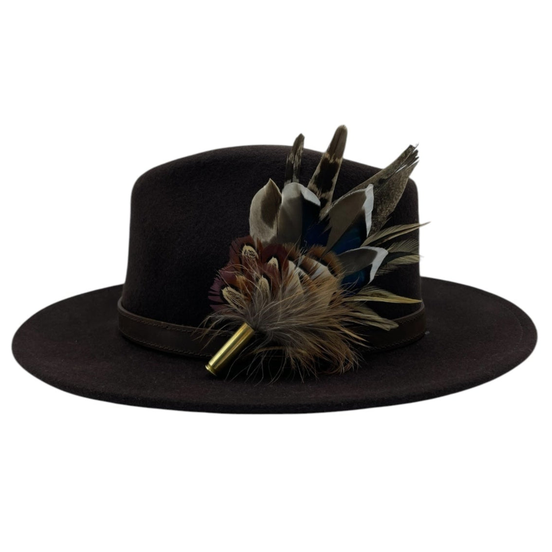 Feathers are in a recycled polished bullet case with a clasp attached for pinning through the ribbon band or over the leather band on the hat. We add a magnet to the feathers for extra security and to minimize the movement of the feathers on the hat.