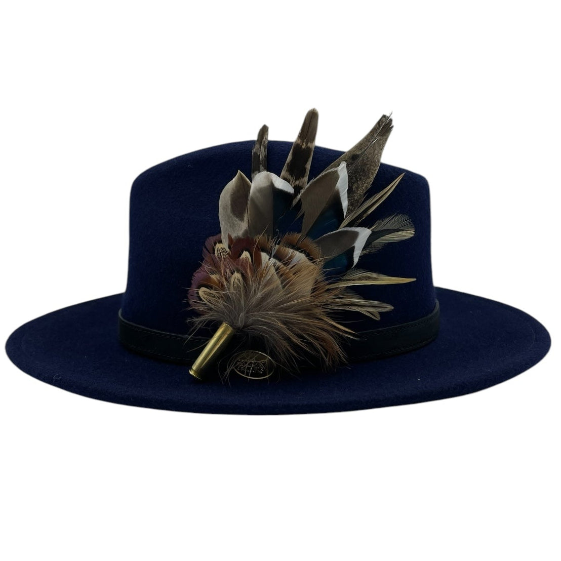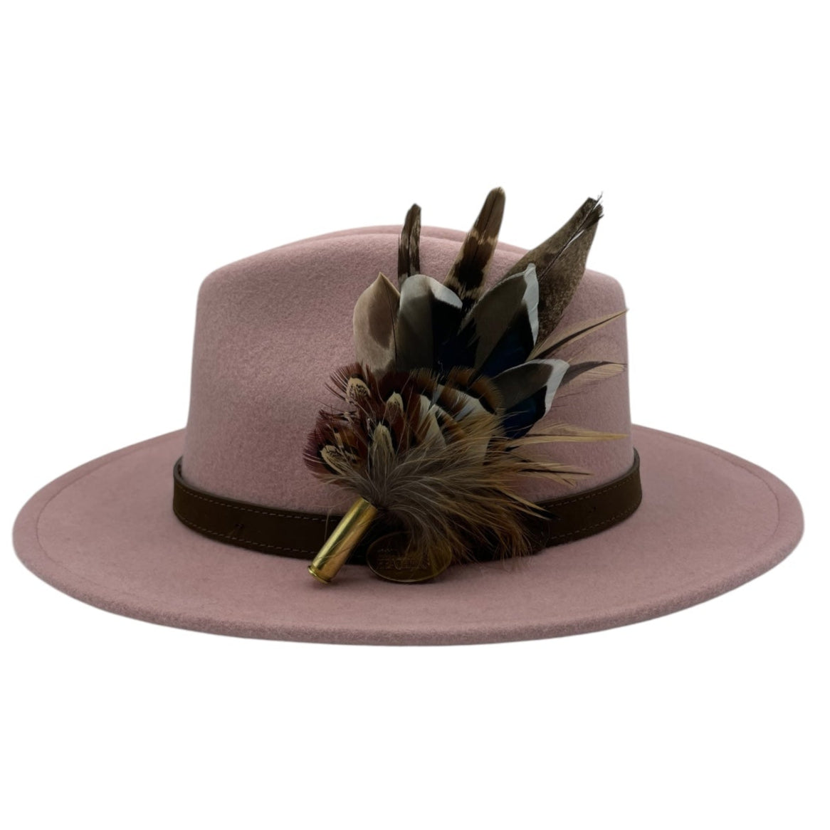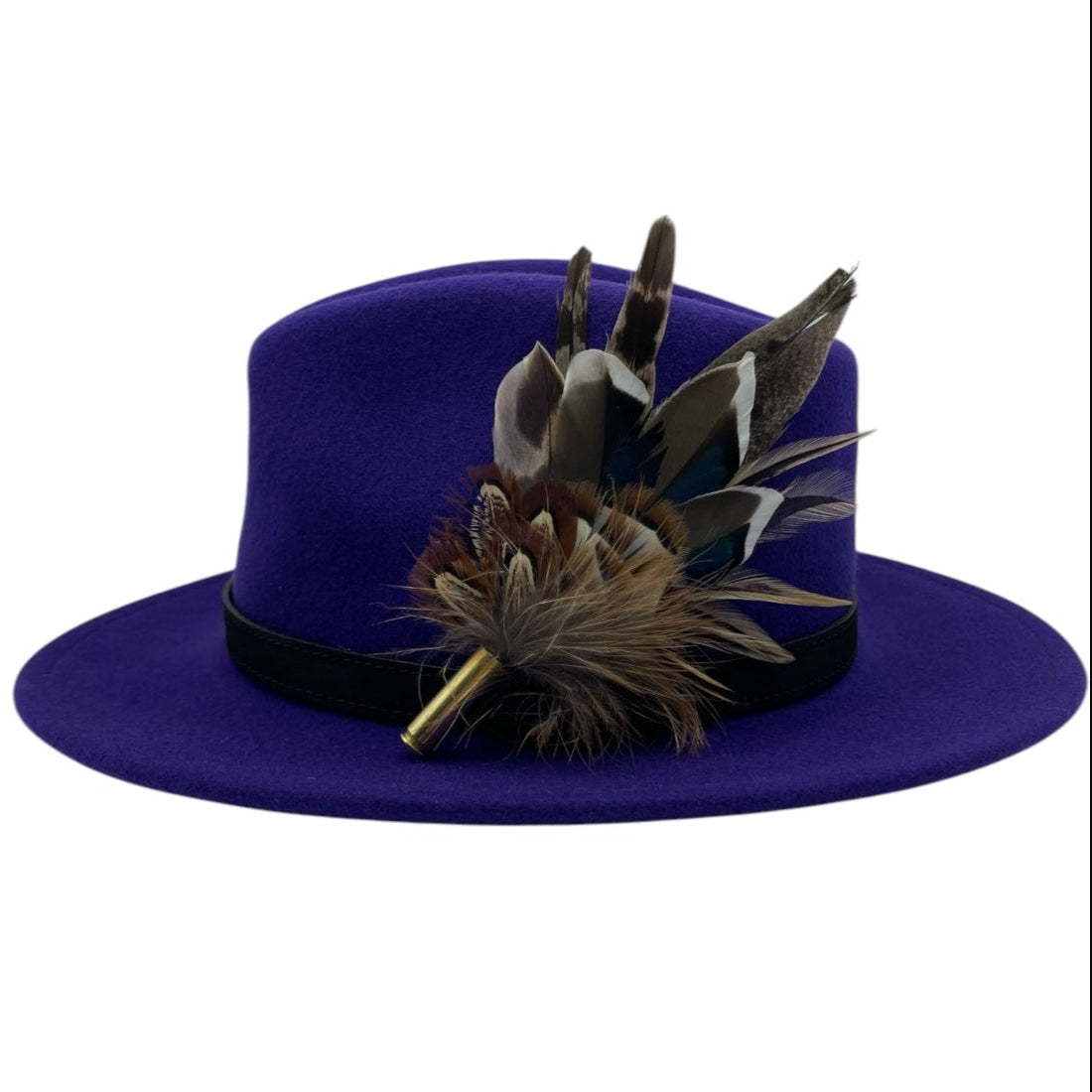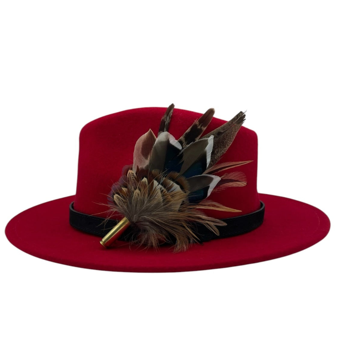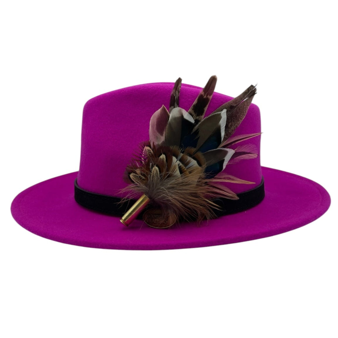 Feathers are in a recycled polished bullet case with a clasp attached for pinning through the ribbon band or over the leather band on the hat. We add a magnet to the feathers for extra security and to minimize the movement of the feathers on the hat.