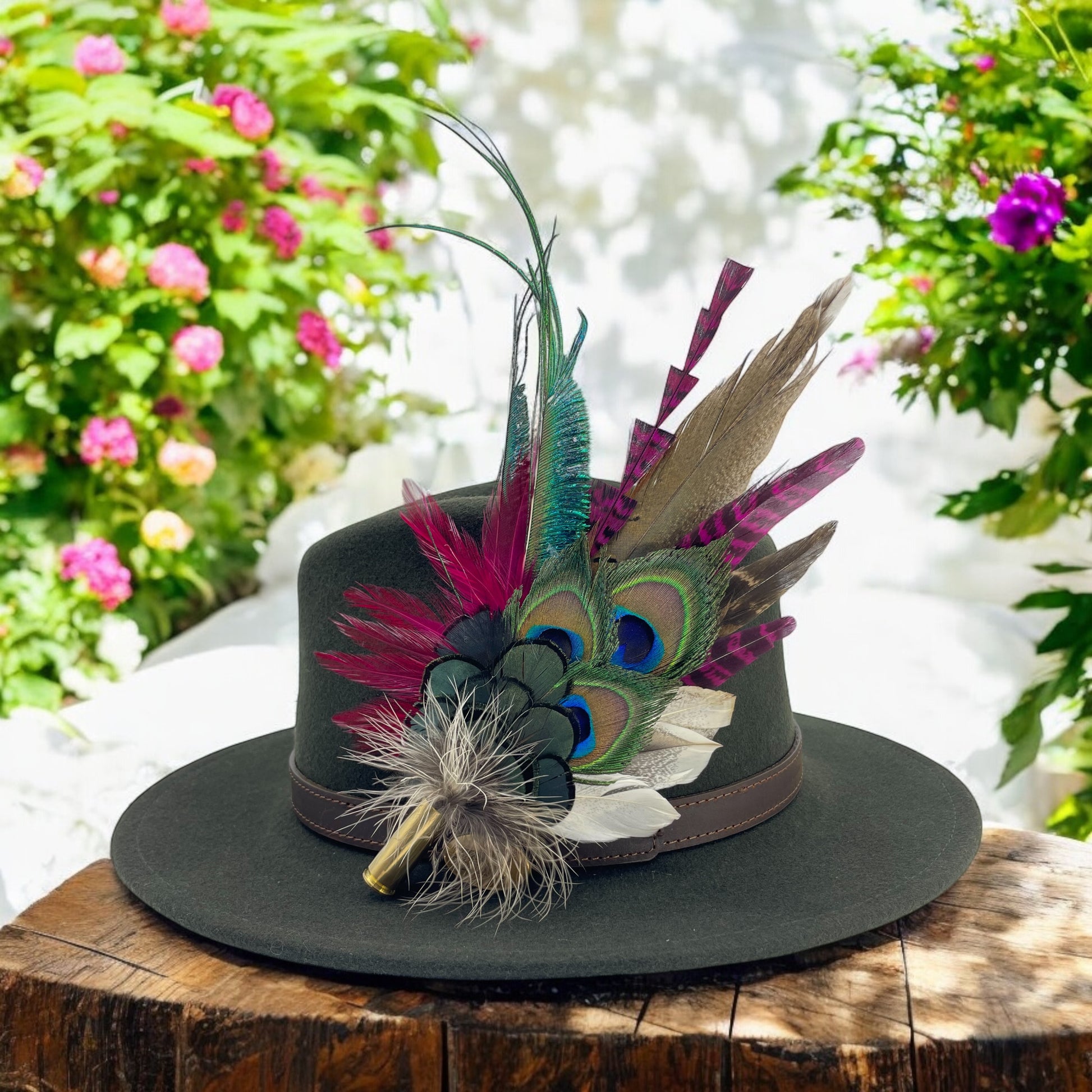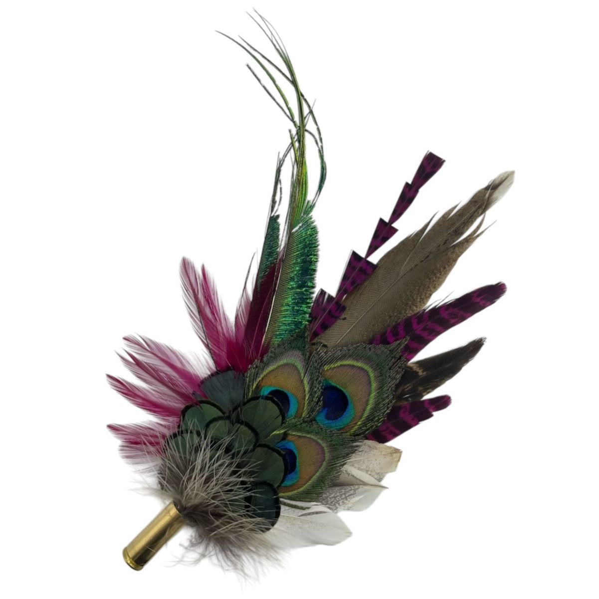 Feathers are in a recycled polished bullet case with a clasp attached for pinning through the ribbon band or over the leather band on the hat. We add a magnet to the feathers for extra security and to minimize the movement of the feathers on the hat.