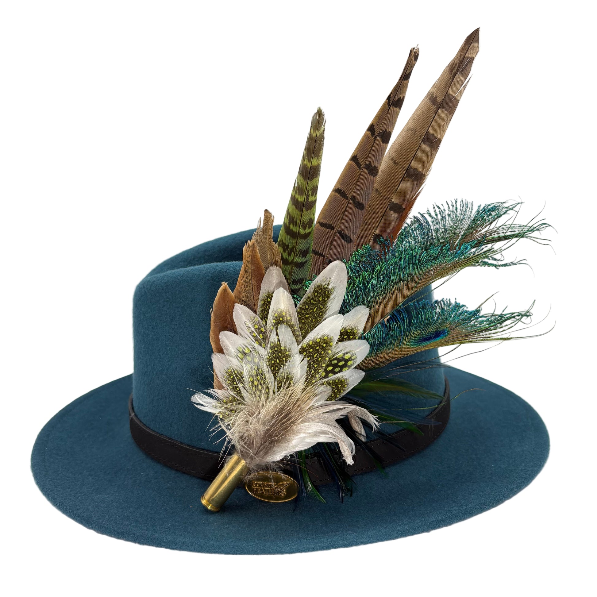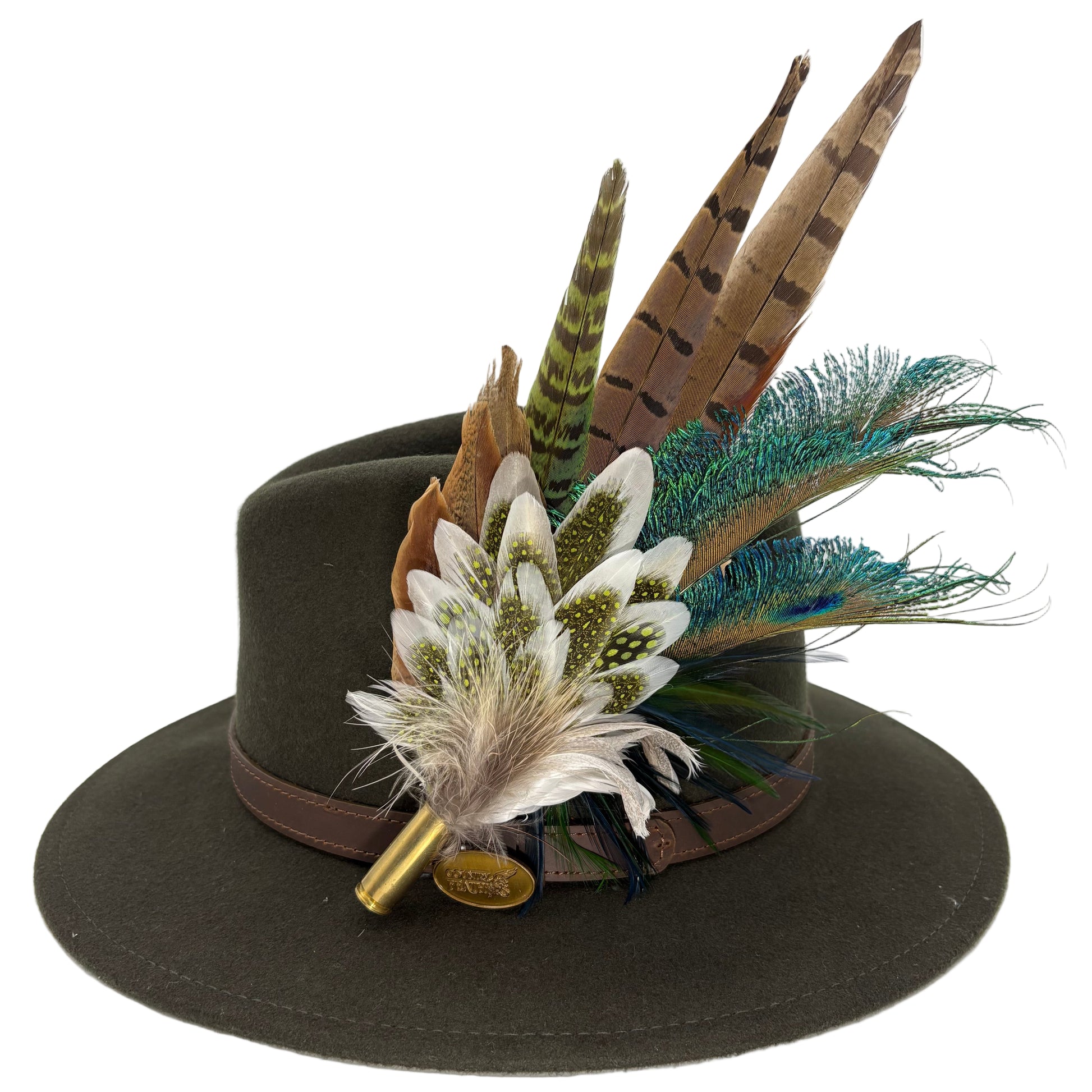 Feathers are in a recycled polished bullet case with a clasp attached for pinning through the ribbon band or over the leather band on the hat. We add a magnet to the feathers for extra security and to minimize the movement of the feathers on the hat.