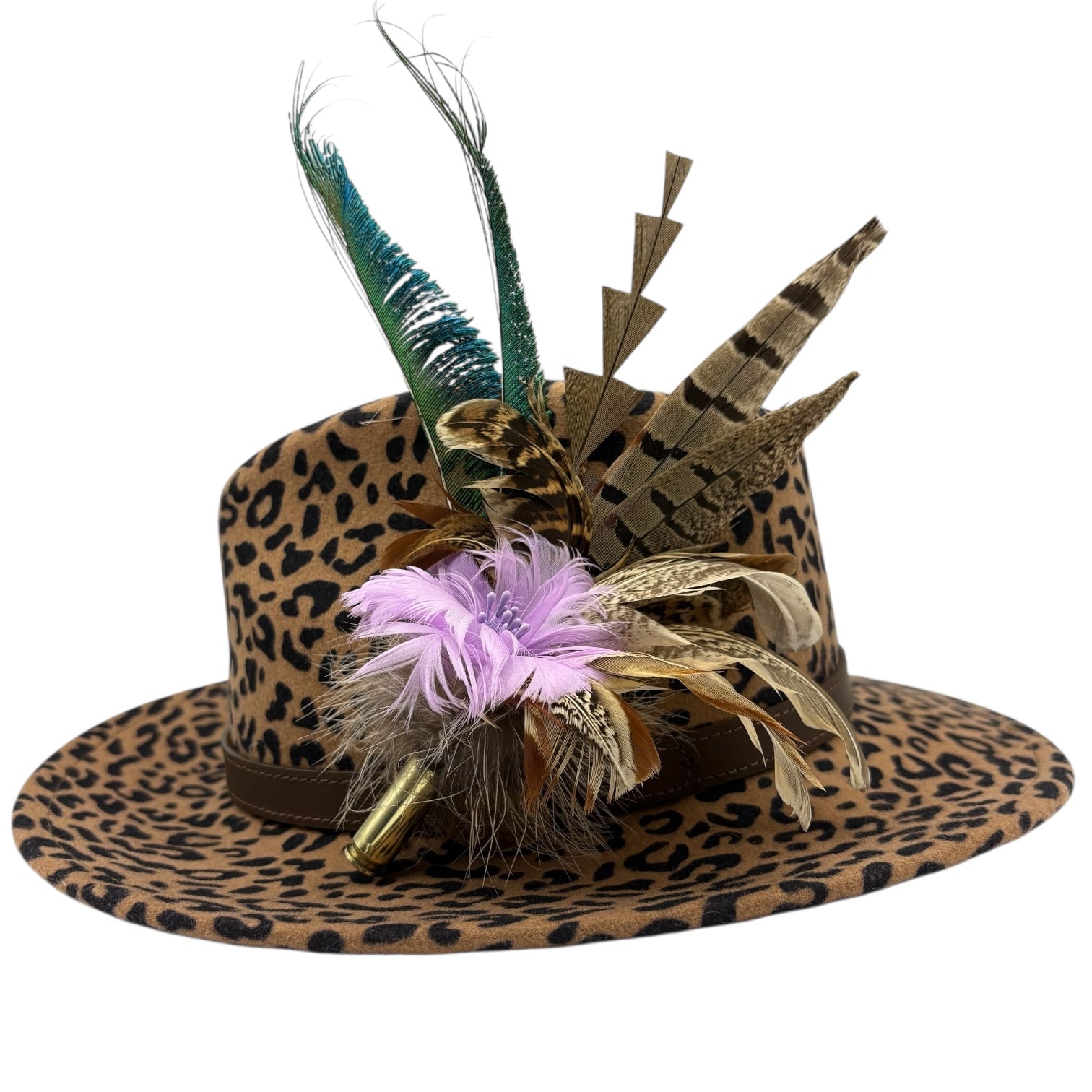 Feathers are in a recycled polished bullet case with a clasp attached for pinning through the ribbon band or over the leather band on the hat. We add a magnet to the feathers for extra security and to minimize the movement of the feathers on the hat.