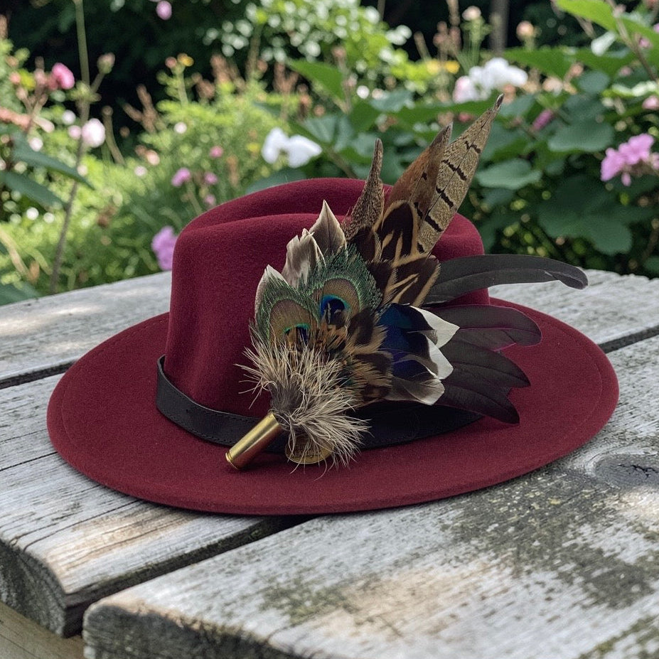 Feathers are in a recycled polished bullet case with a clasp attached for pinning through the ribbon band or over the leather band on the hat. I have added a magnet to the feathers for extra security and to minimize the movement of the feathers on the hat.