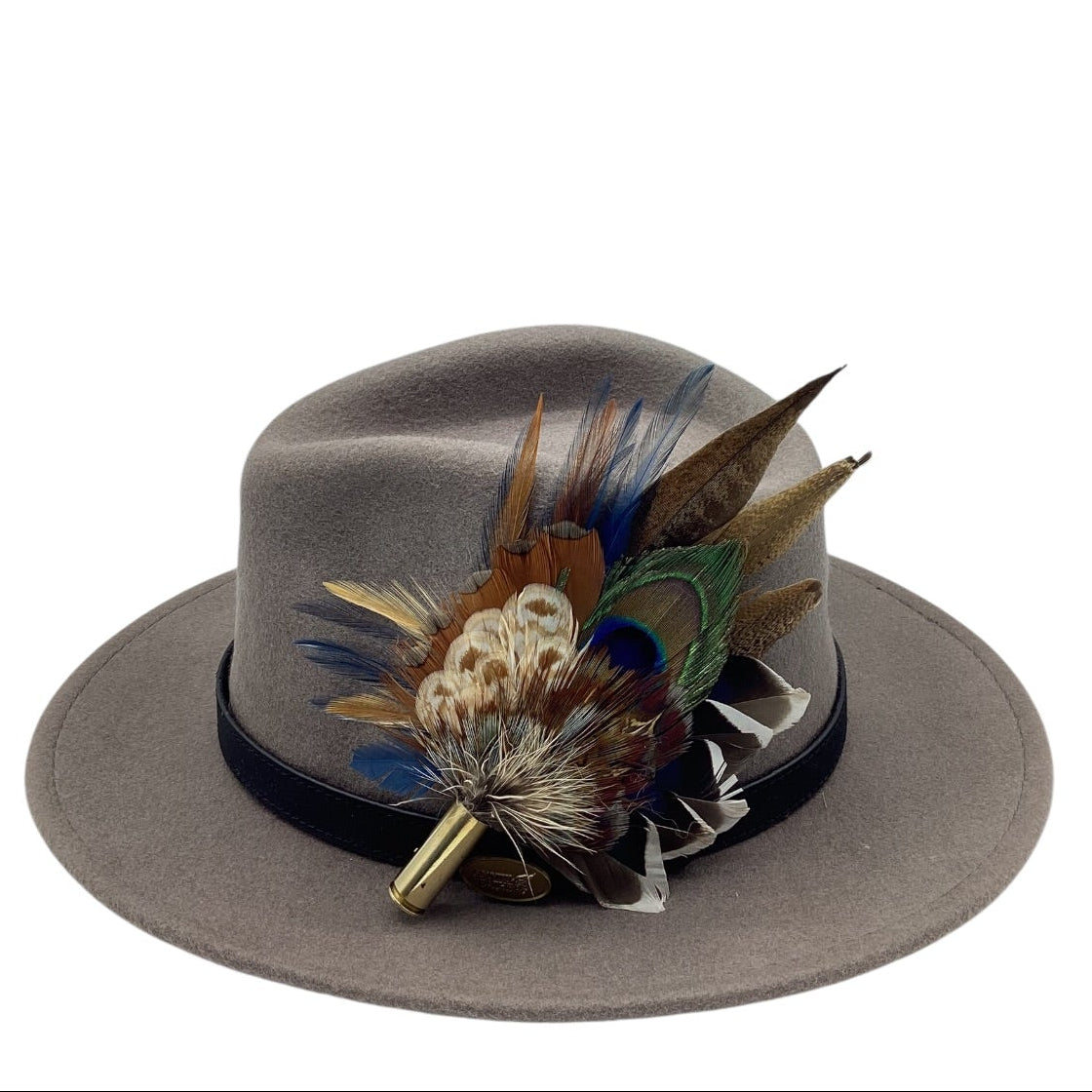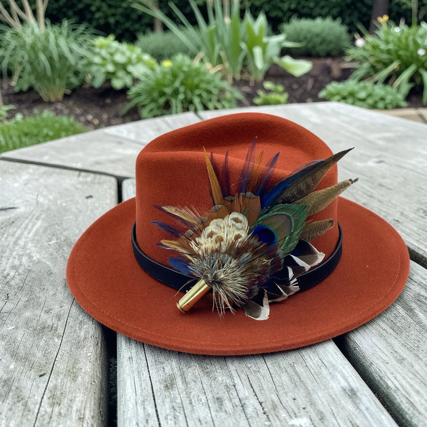 Feathers are in a recycled polished bullet case with a clasp attached for pinning through the ribbon band or over the leather band on the hat. I have added a magnet to the feathers for extra security and to minimize the movement of the feathers on the hat.