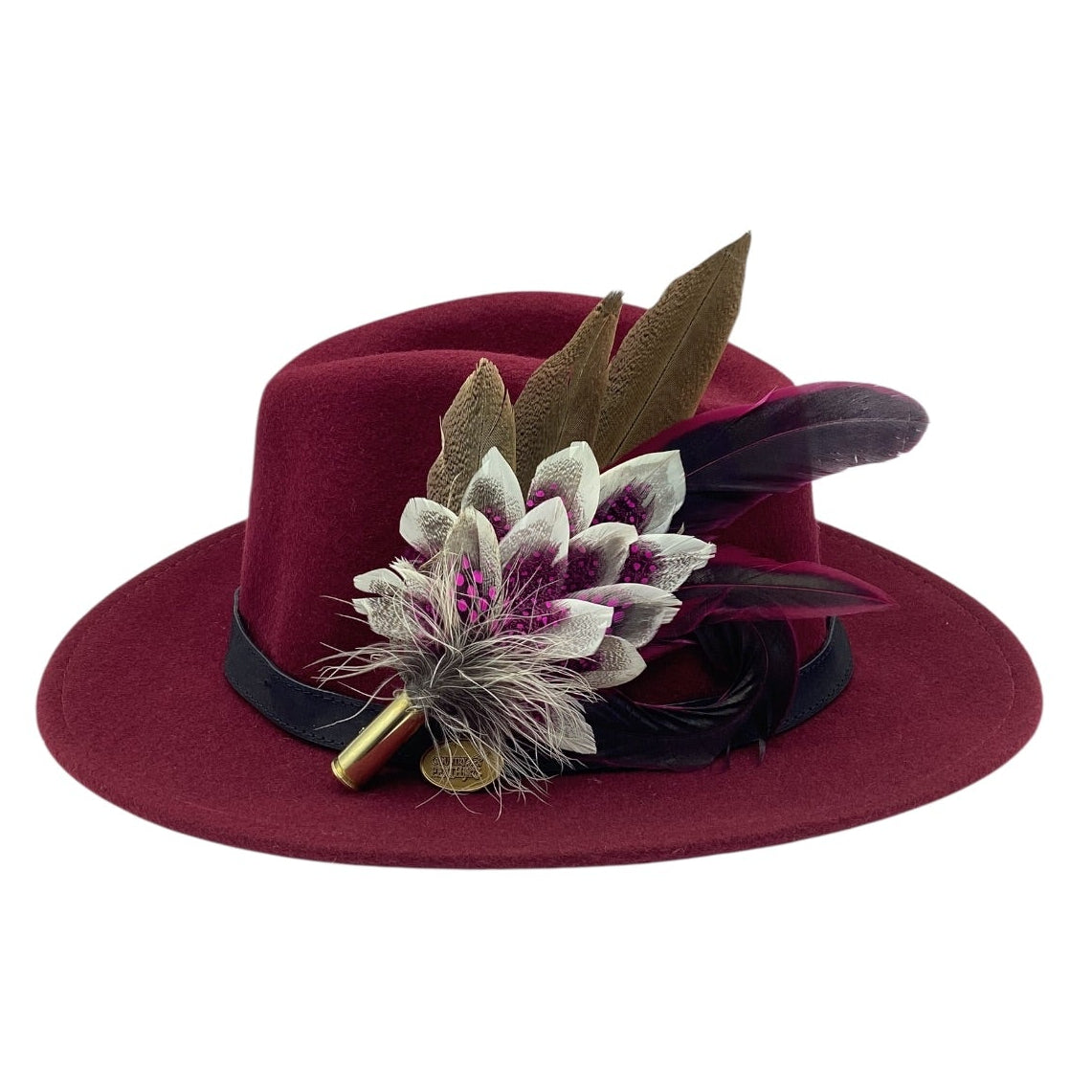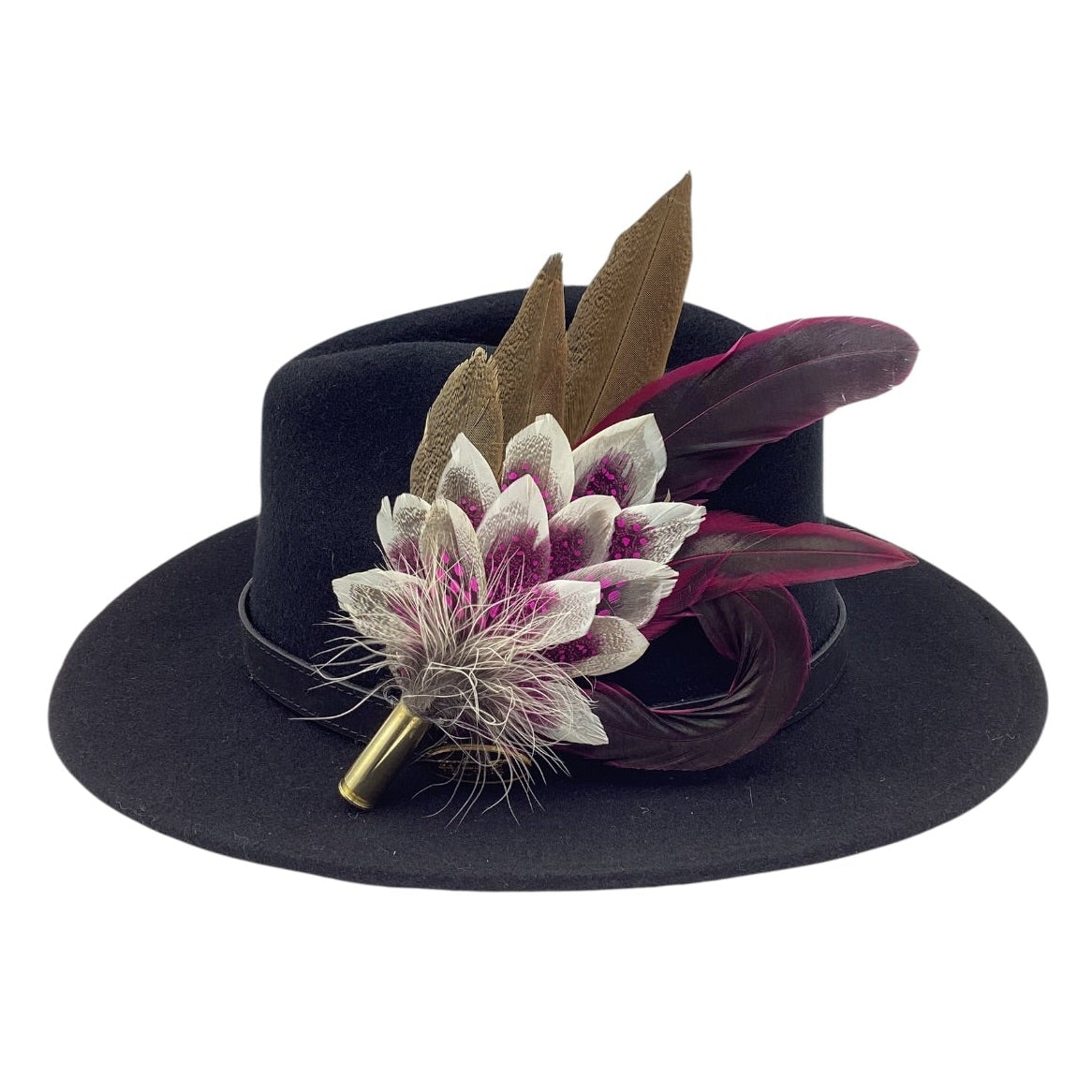 Feathers are in a recycled polished bullet case with a clasp attached for pinning through the ribbon band or over the leather band on the hat. I have added a magnet to the feathers for extra security and to minimize the movement of the feathers on the hat.