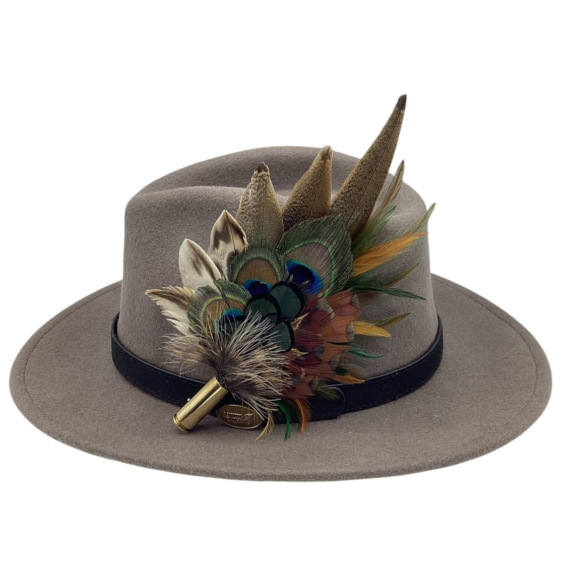 Feathers are in a recycled polished bullet case with a clasp attached for pinning through the ribbon band or over the leather band on the hat. I have add a magnet to the feathers for extra security and to minimize the movement of the feathers on the hat.