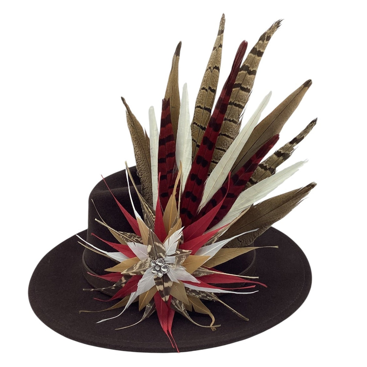 Feathers are in a recycled polished bullet case with a clasp attached for pinning through the ribbon band or over the leather band on the hat. I have added a magnet to the feathers for extra security and to minimize the movement of the feathers on the hat.
