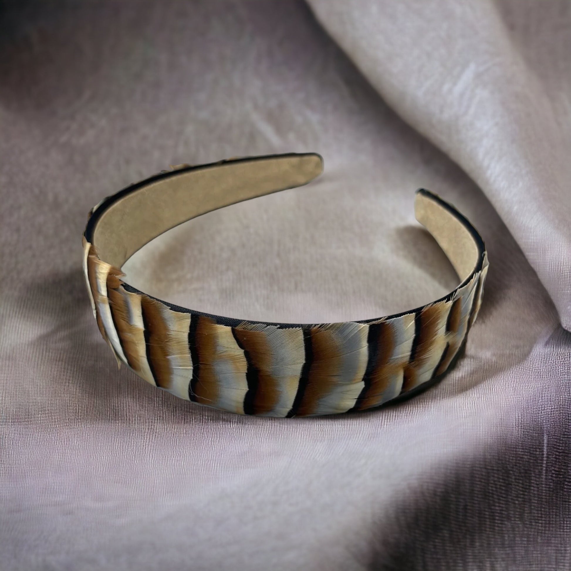 A hand craft Partridge feathers to create a striking hairband in natural tones.