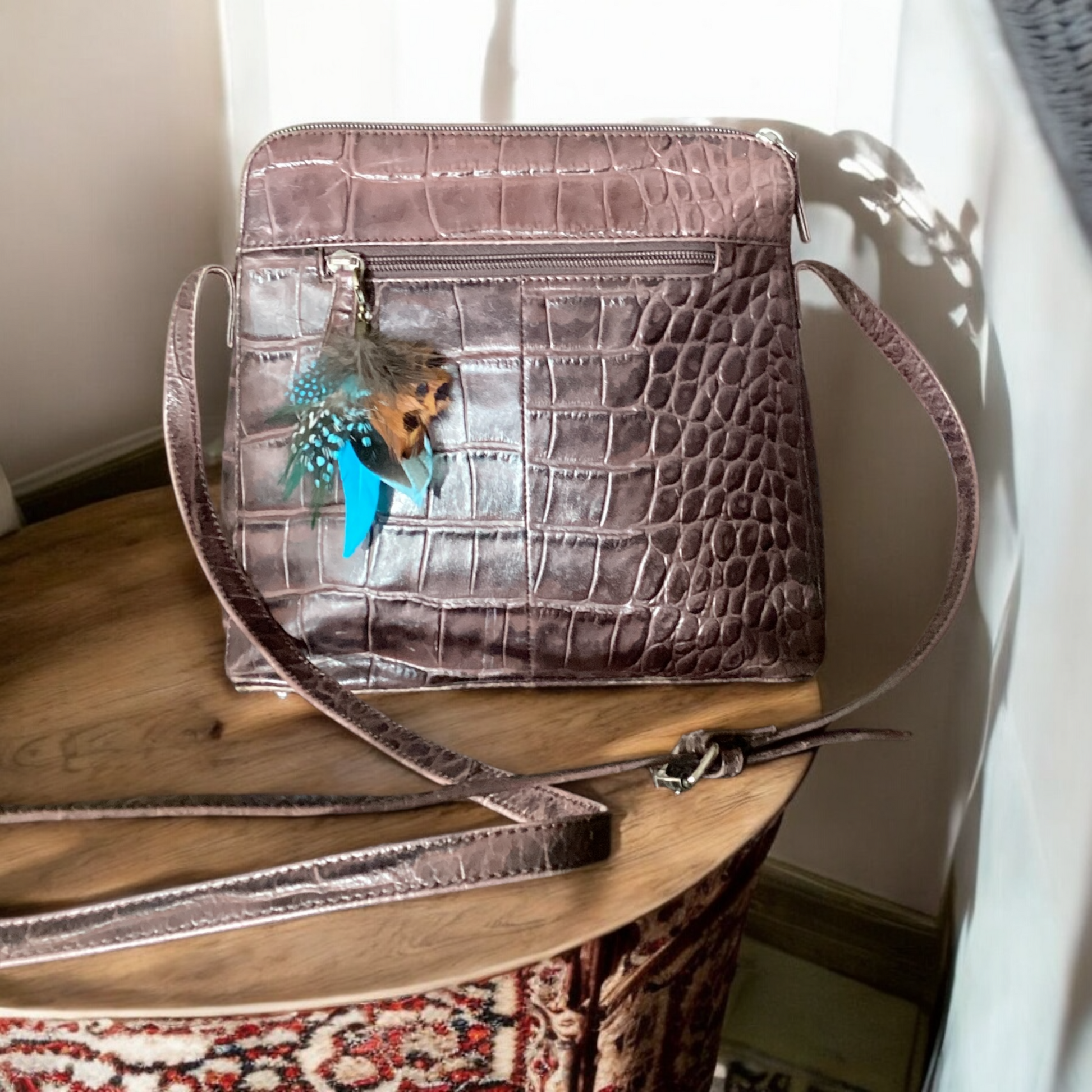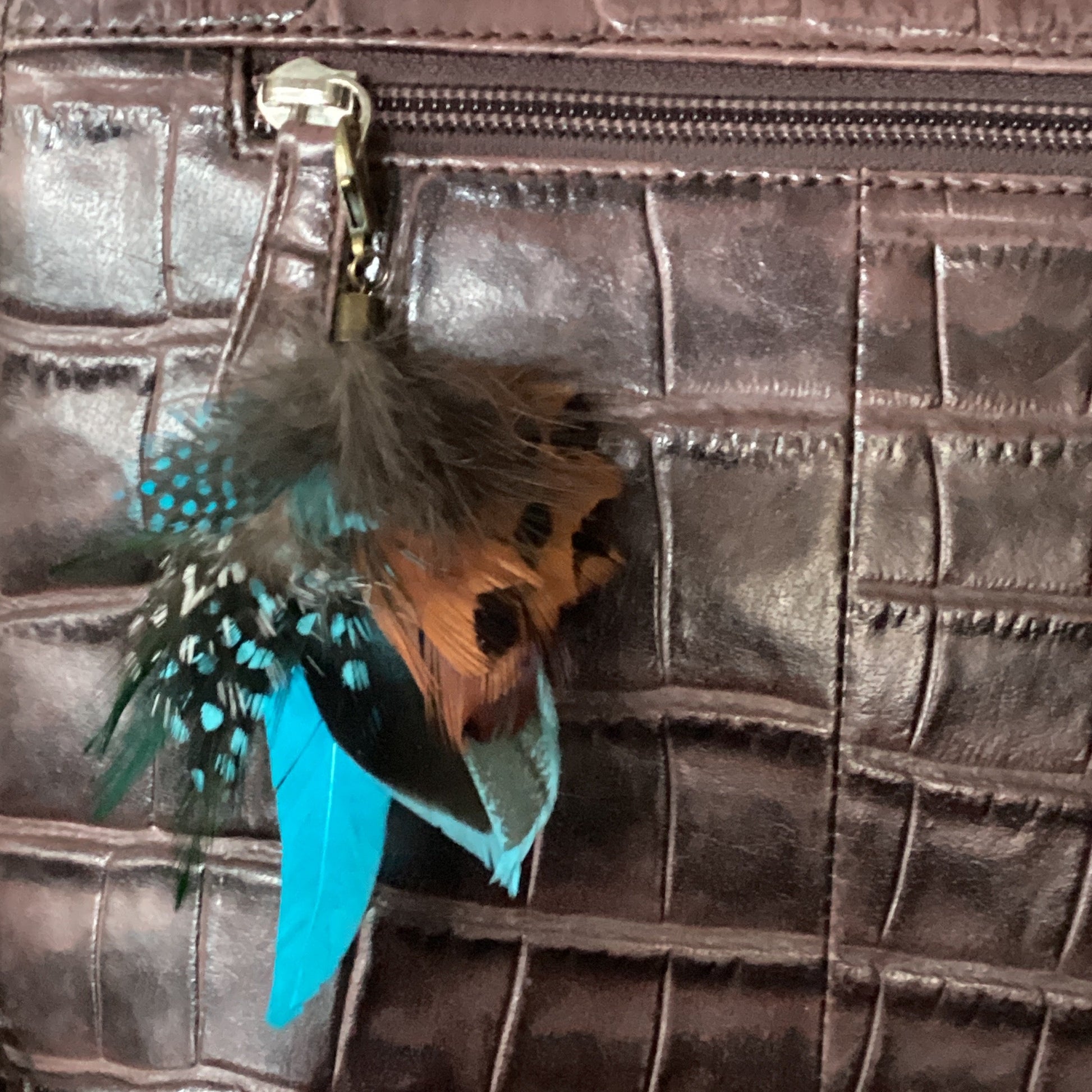 A brass style handbag charm with duck, rooster, goose, guinea fowl and pheasant feathers. Attach it to a zip or strap chain for a stunning accessory to your bag or purse.