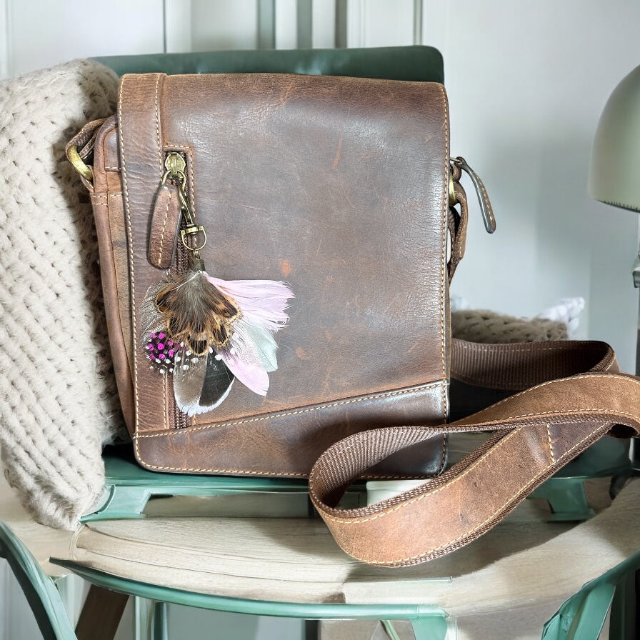 A brass style handbag charm with duck, goose, guinea fowl and pheasant feathers. Attach it to a zip or strap chain for a stunning accessory to your bag or purse.