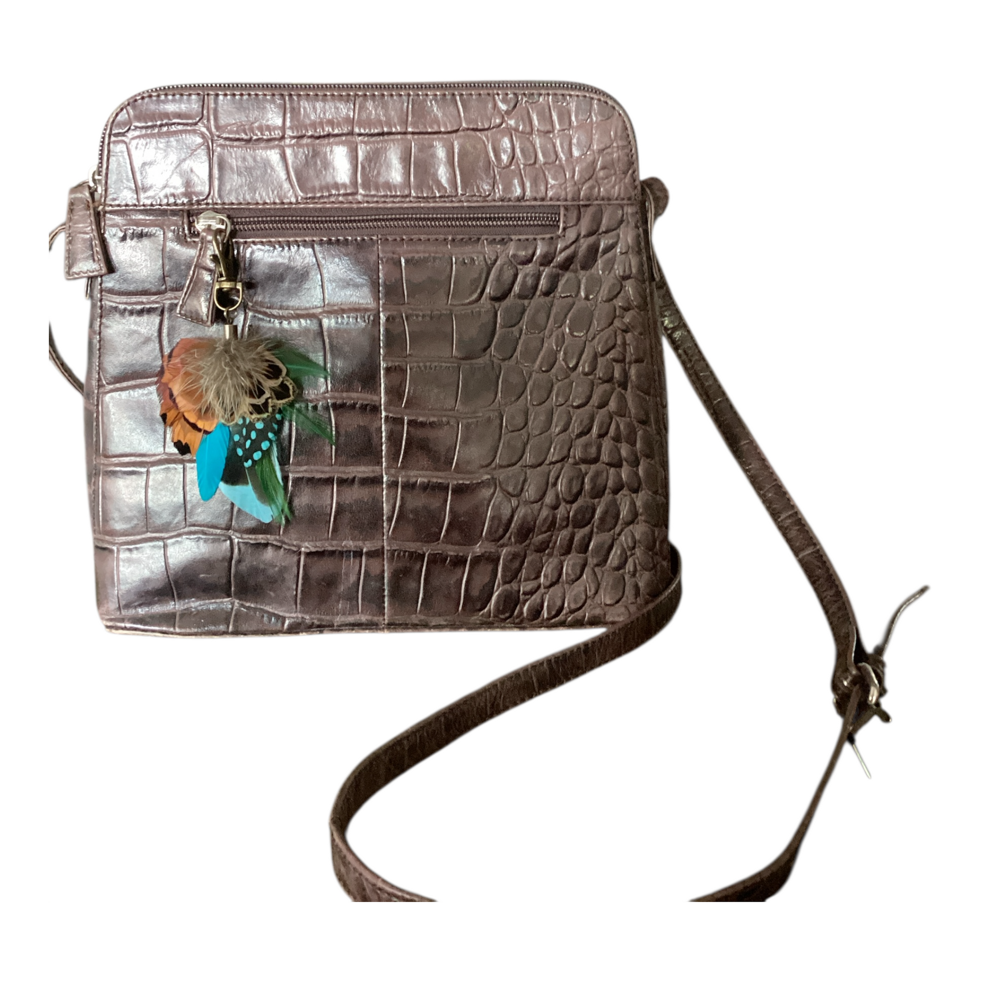 A brass style handbag charm with duck, rooster, goose, guinea fowl and pheasant feathers. Attach it to a zip or strap chain for a stunning accessory to your bag or purse.