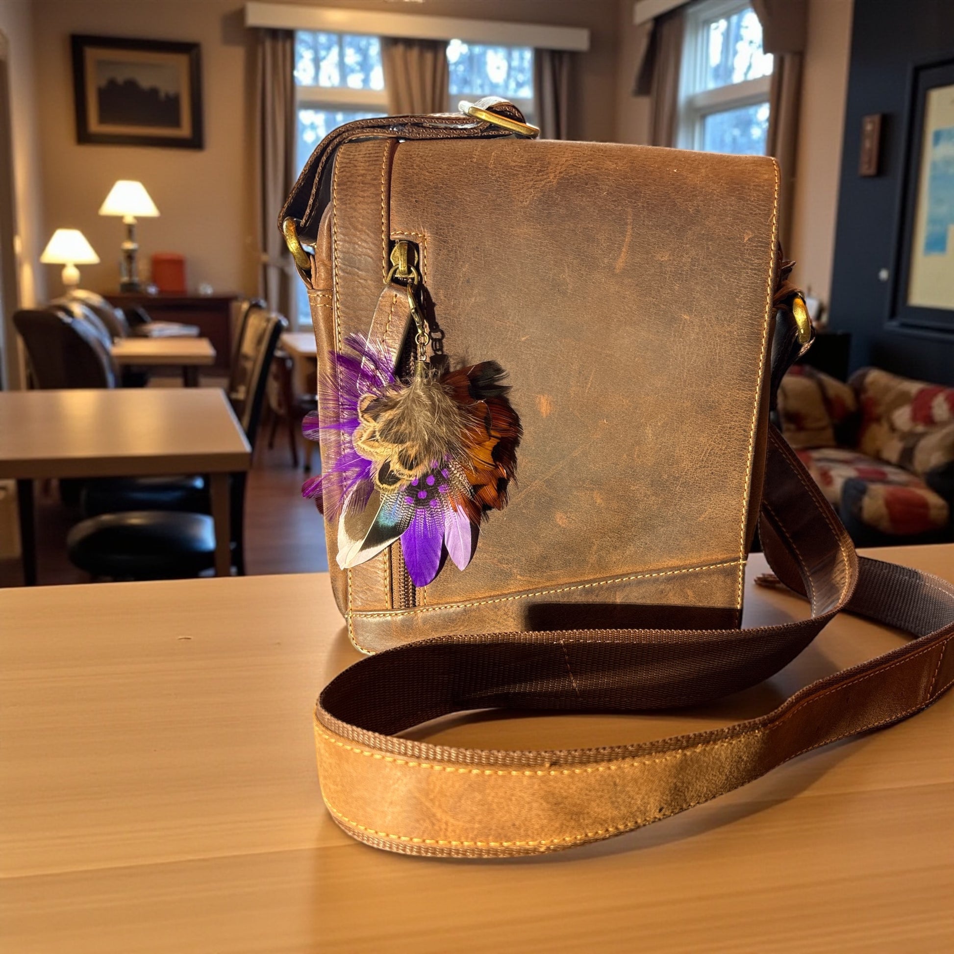 A brass style handbag charm with duck, rooster, guinea fowl, goose and pheasant feathers. Attach it to a zip or strap chain for a stunning accessory to your bag or purse.