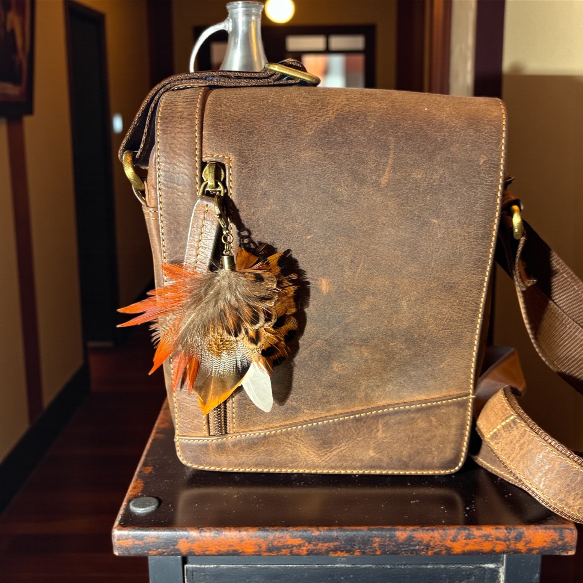 A brass style handbag charm with duck, rooster, guinea fowl and pheasant feathers. Attach it to a zip or strap chain for a stunning accessory to your bag or purse.