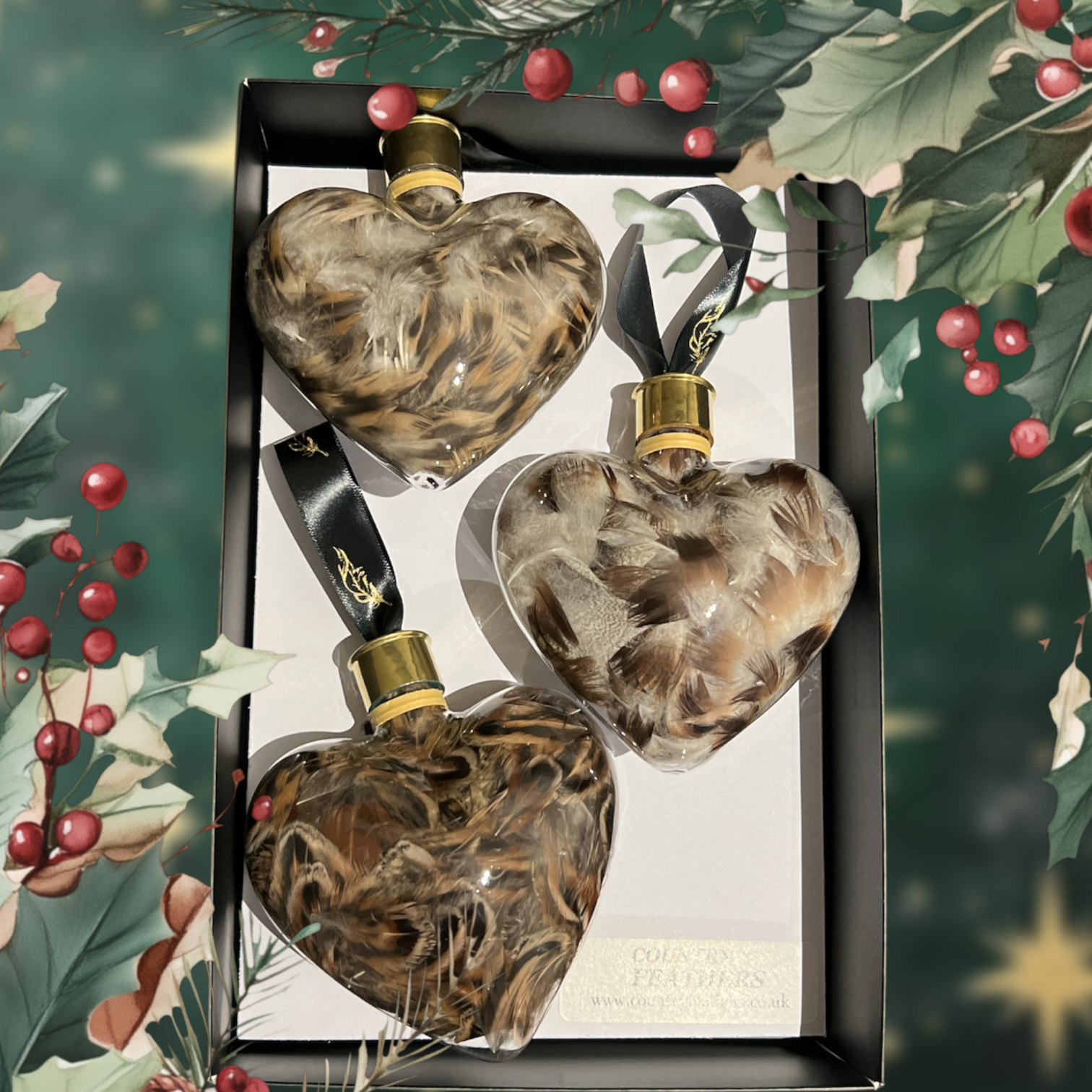 A box of 3 heart baubles with natural feathers from local game shoots. Each bauble is sealed with a polished recycled cartridges head and is ready to hang on your tree. Each of the baubles are made from clear glass and will add a country look to your tree this Christmas.