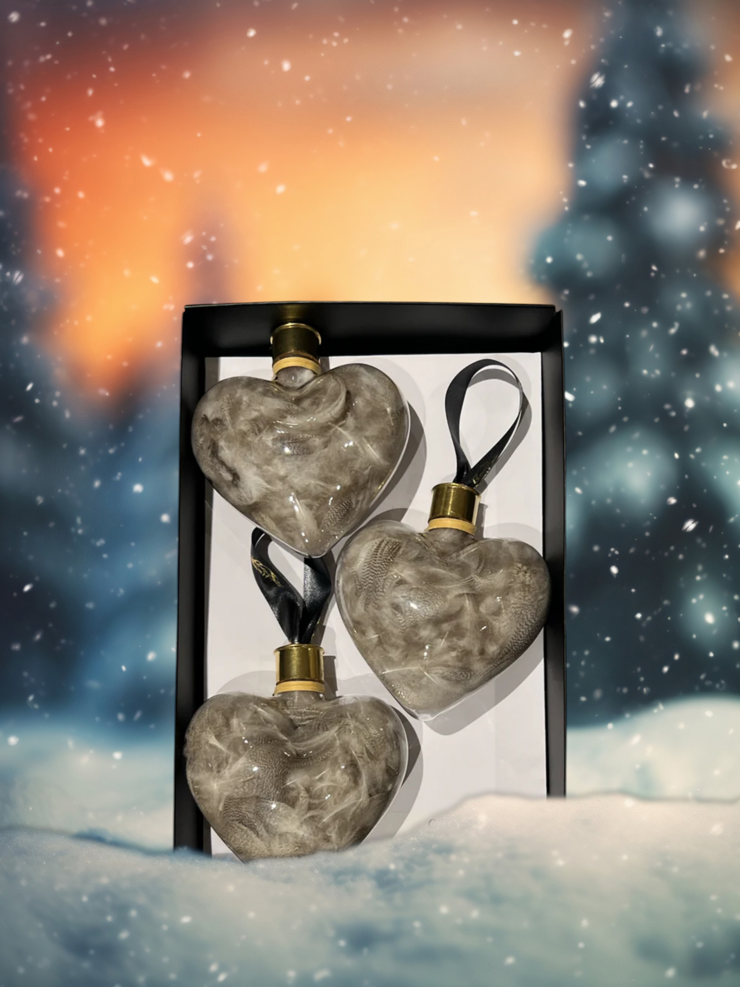 A box of 3 heart baubles with natural feathers from local game shoots. Each bauble is sealed with a polished recycled cartridges head and is ready to hang on your tree. Each of the baubles are made from clear glass and will add a country look to your tree this Christmas.