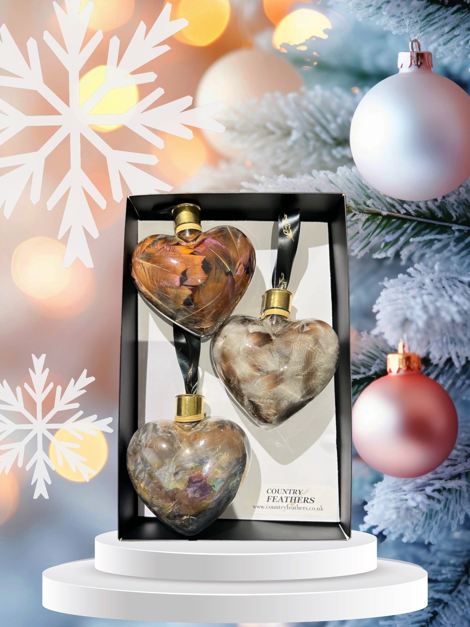 A box of 3 heart baubles with mixed natural feathers from local game shoots. Each bauble is sealed with a polished recycled cartridges head and is ready to hang on your tree. Each of the baubles are made from clear glass and will add a country look to your tree this Christmas.