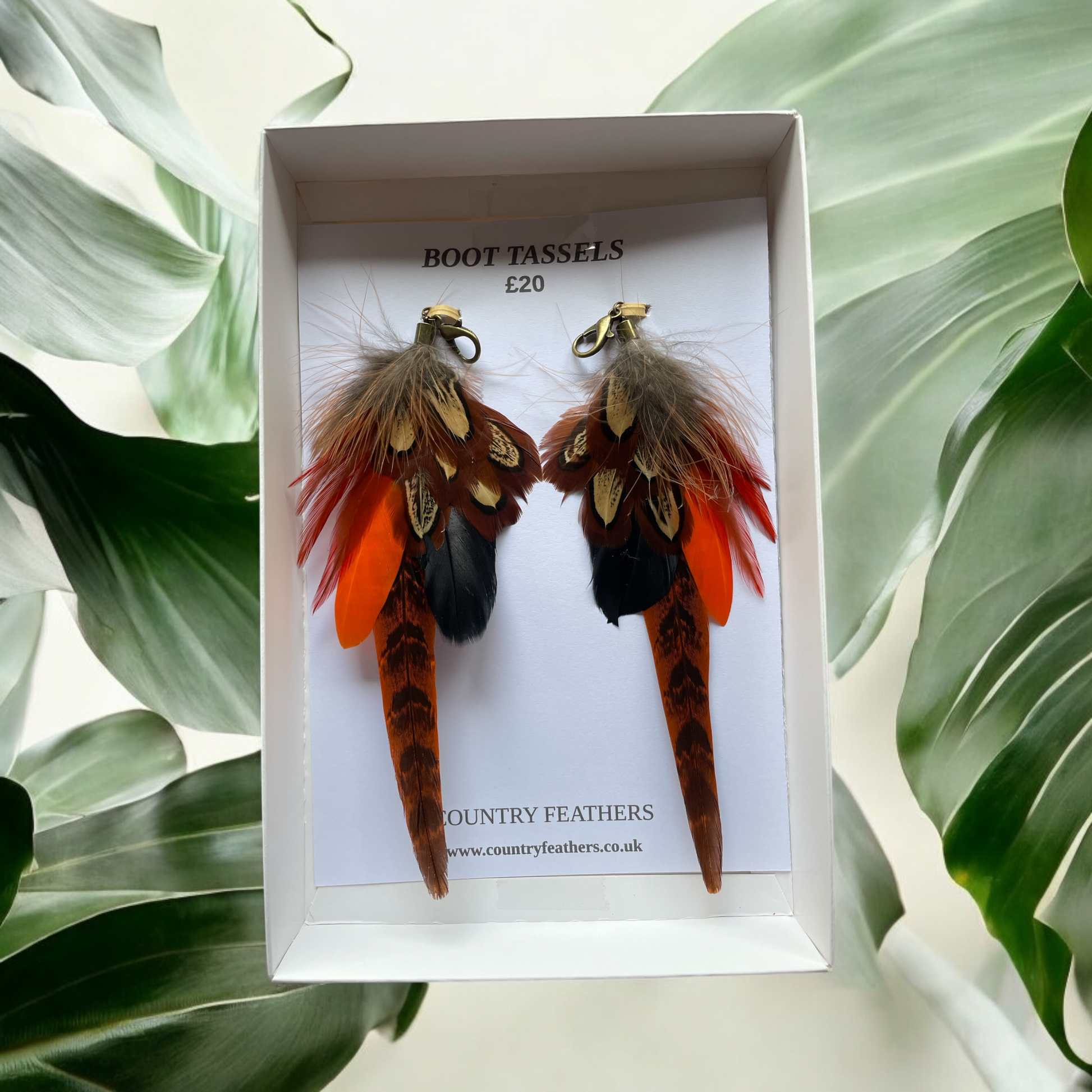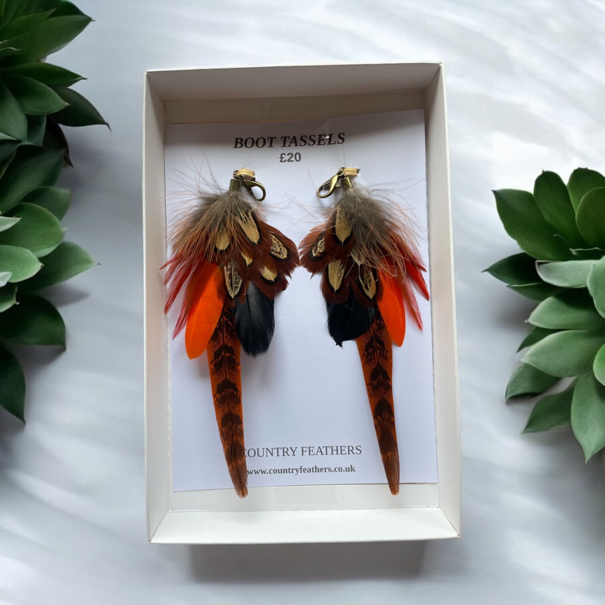 A pair of brass style boot tassels with pheasant and goose feathers with small clasp to attach to the outside zip for a stunning accessory to your boots.