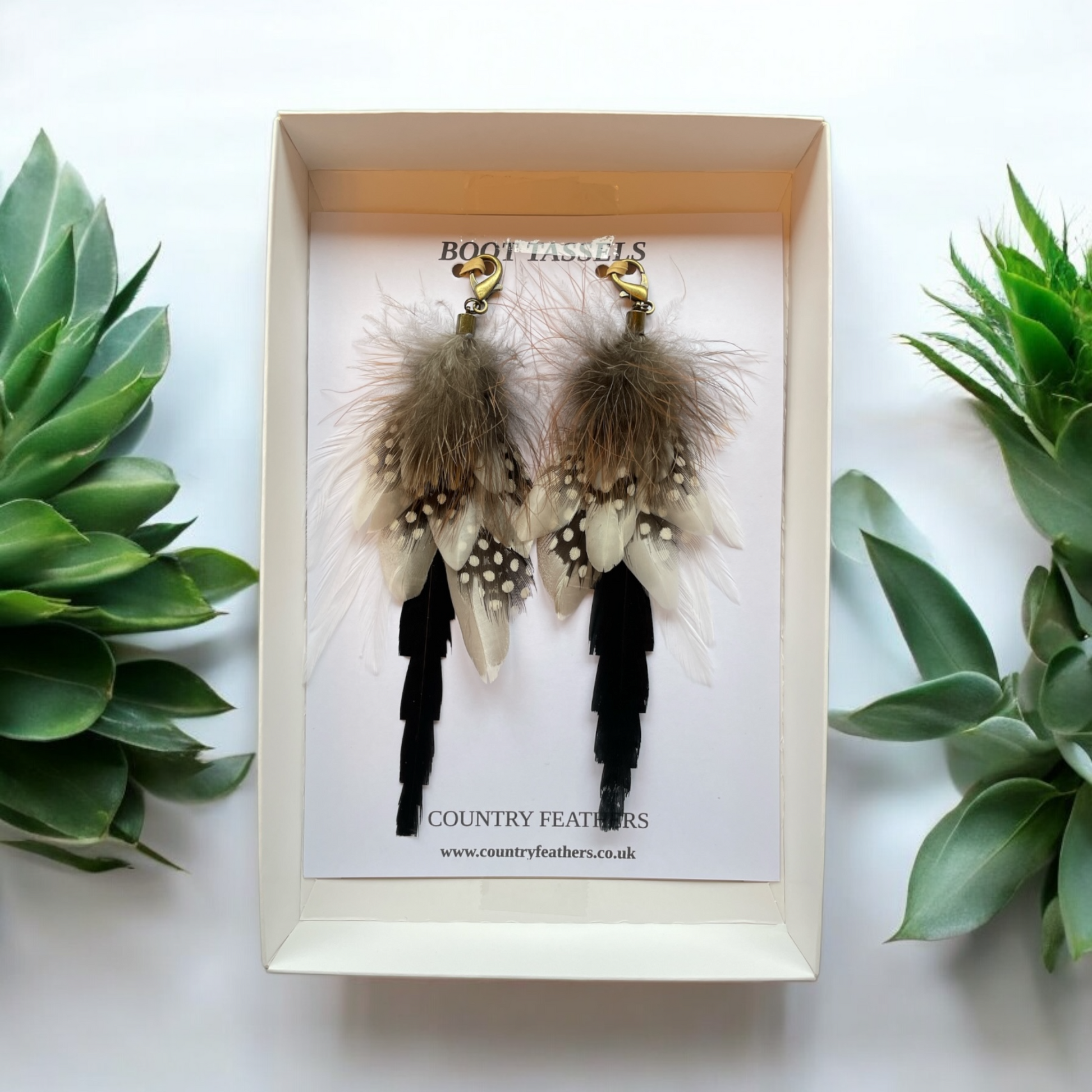 A pair of brass style boot tassels with pheasant, duck, rooster and guinea fowl feathers with small clasp to attach to the outside zip for a stunning accessory to your boots.