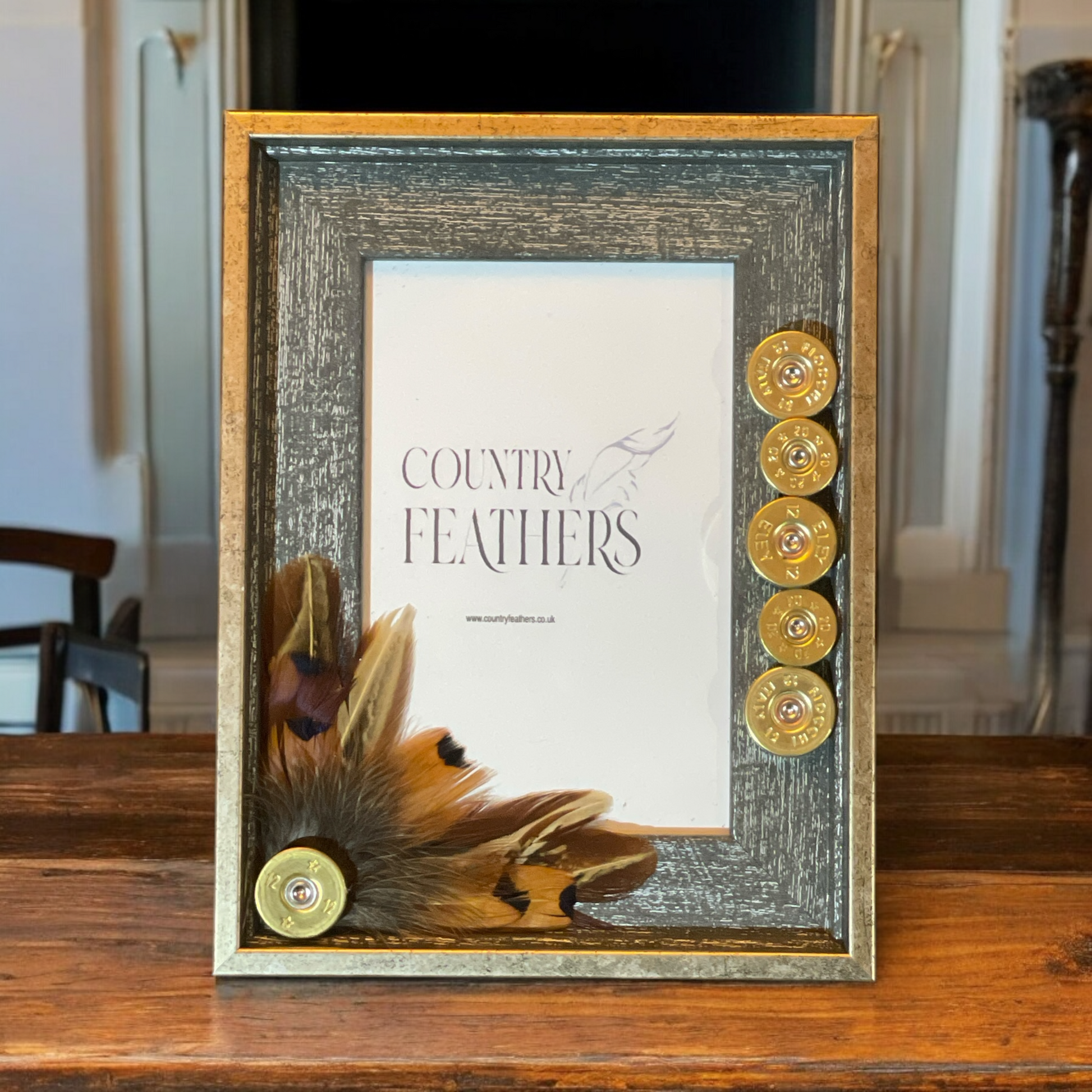 A rustic grey wood effect frame with a subtle metallic gold edging decorated in a recycled polished cartridge heads with pheasant feathers. The country inspired frame fits a single 6x4 inch photo and can be wall hung or stood to suit your space.