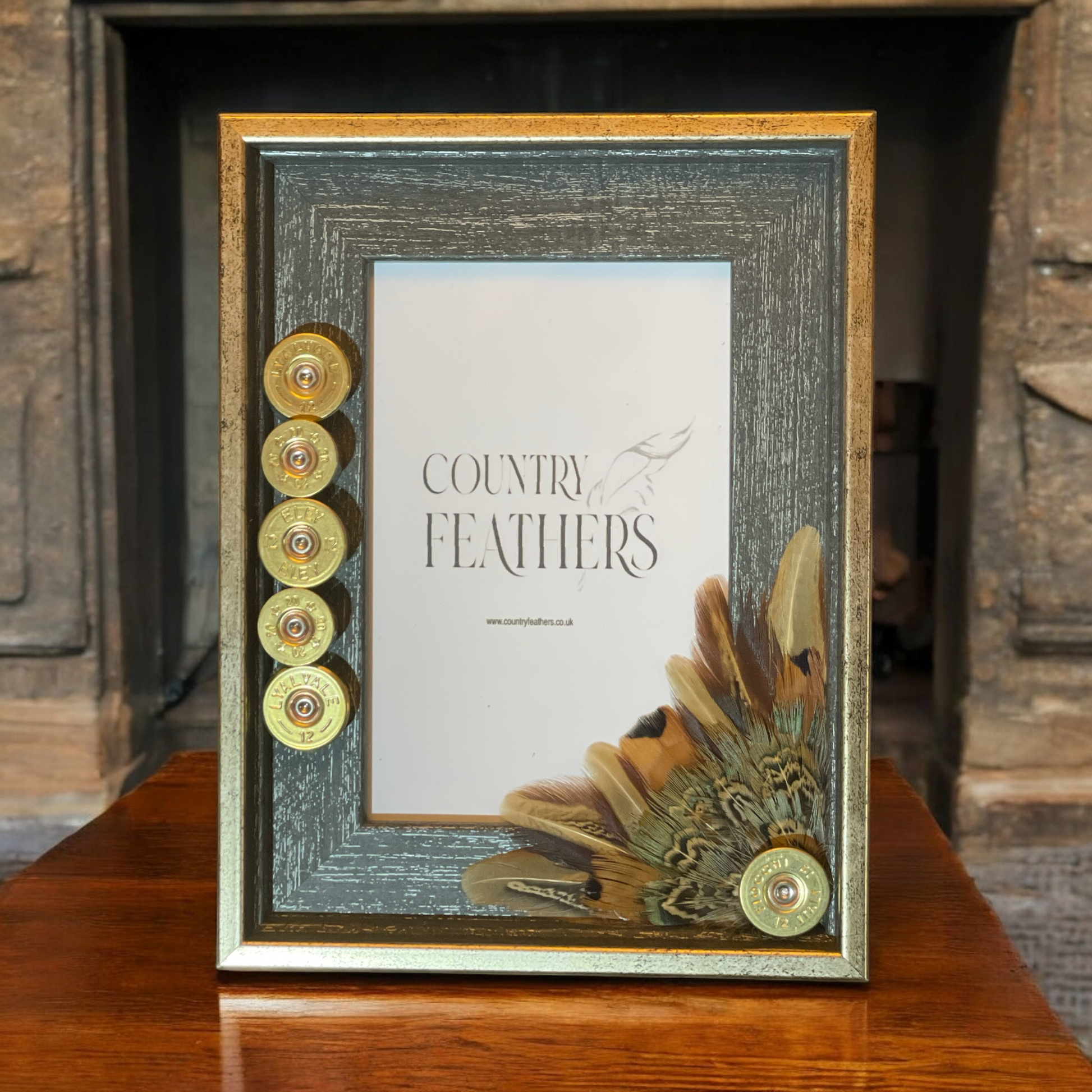 A rustic grey wood effect frame with a subtle metallic gold edging decorated in a recycled polished cartridge heads with pheasant feathers. The country inspired frame fits a single 6x4 inch photo and can be wall hung or stood to suit your space.