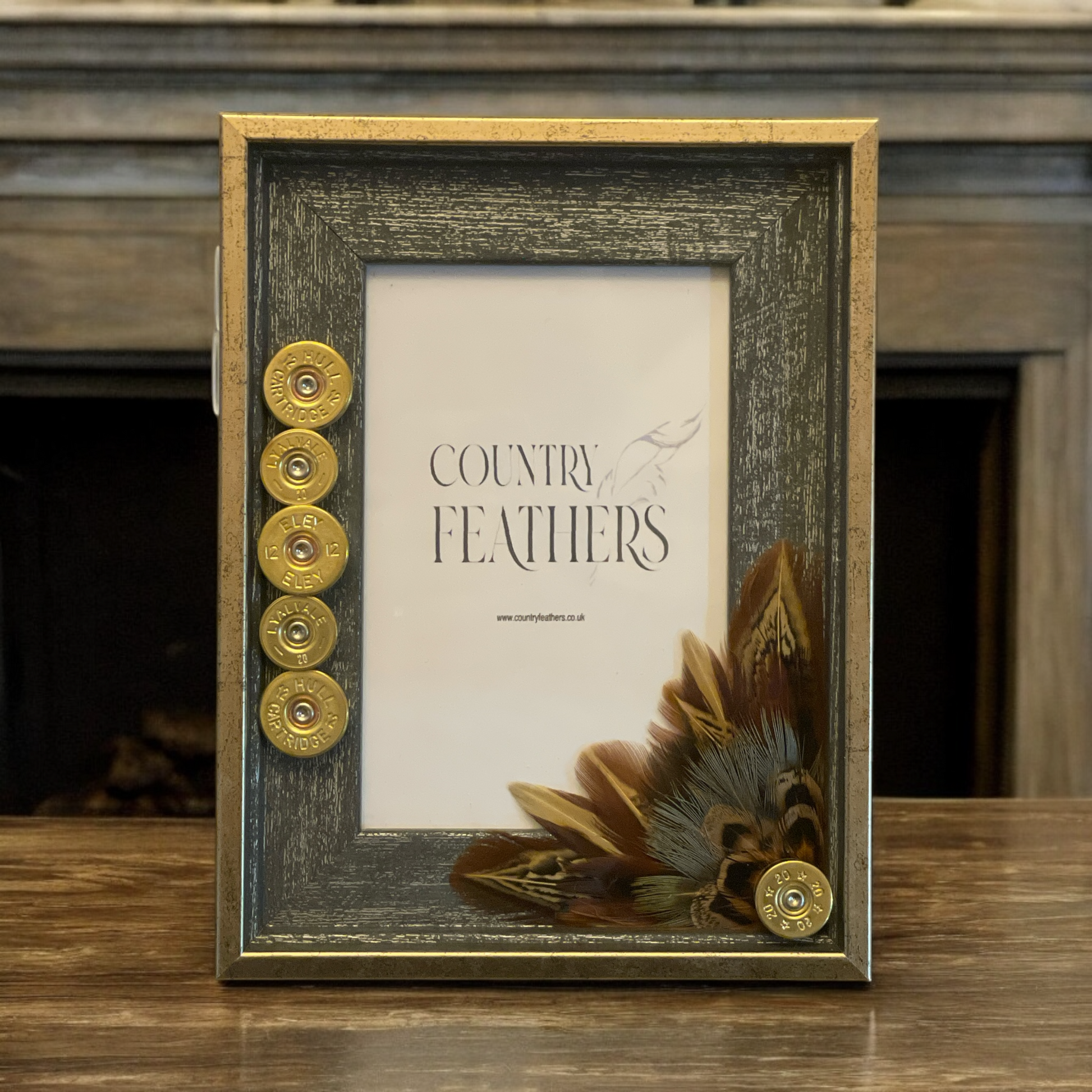 A rustic grey wood effect frame with a subtle metallic gold edging decorated in a recycled polished cartridge heads with pheasant feathers. The country inspired frame fits a single 6x4 inch photo and can be wall hung or stood to suit your space.