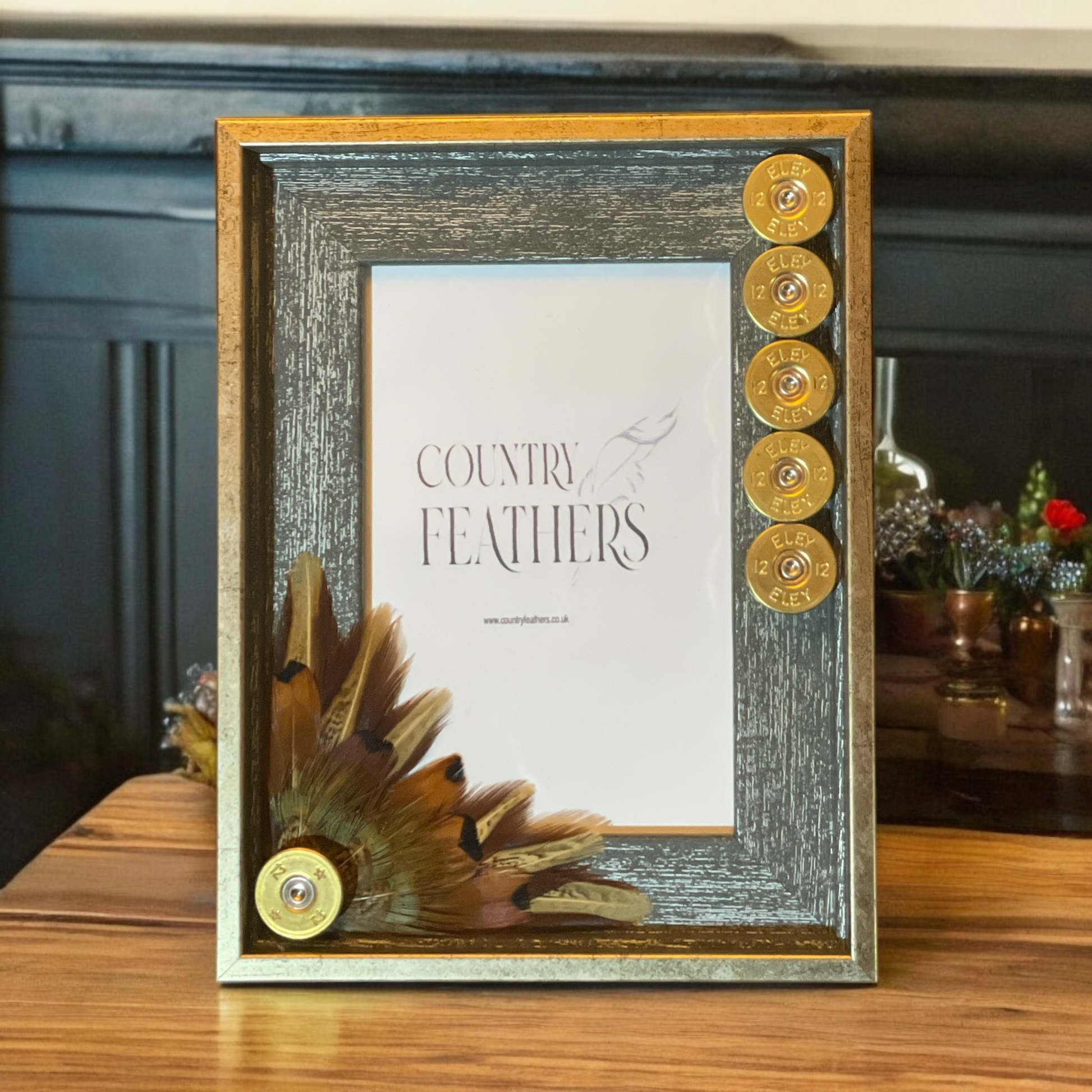 A rustic grey wood effect frame with a subtle metallic gold edging decorated in a recycled polished cartridge heads with pheasant feathers. The country inspired frame fits a single 6x4 inch photo and can be wall hung or stood to suit your space.