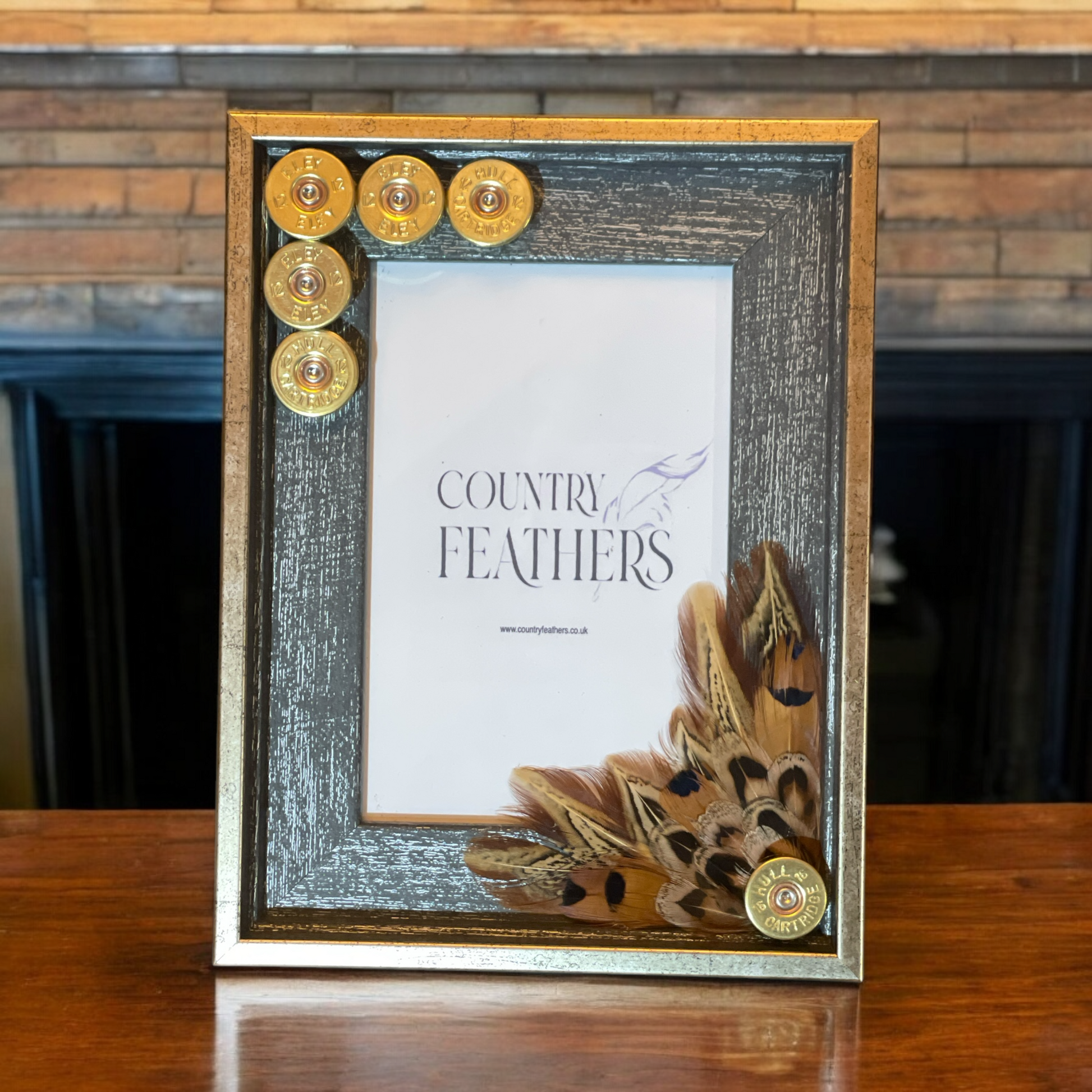 A rustic grey wood effect frame with a subtle metallic gold edging decorated in a recycled polished cartridge heads with pheasant feathers. The country inspired frame fits a single 6x4 inch photo and can be wall hung or stood to suit your space.