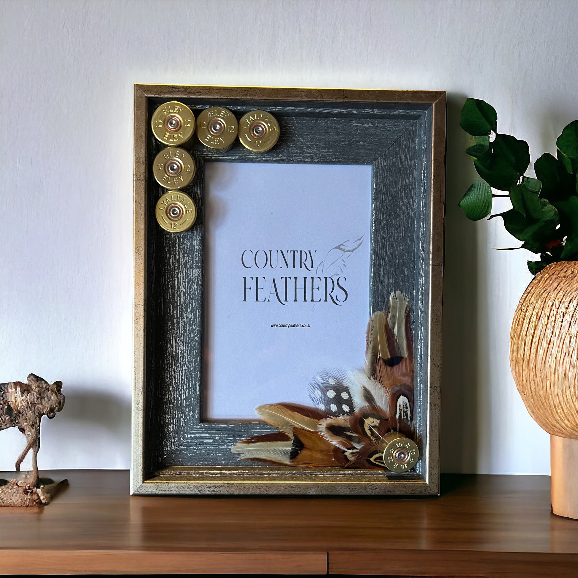 A rustic grey wood effect frame with a subtle metallic gold edging decorated in a recycled polished cartridge heads with pheasant, duck and guinea fowl feathers. The country inspired frame fits a single 6x4 inch photo and can be wall hung or stood to suit your space.