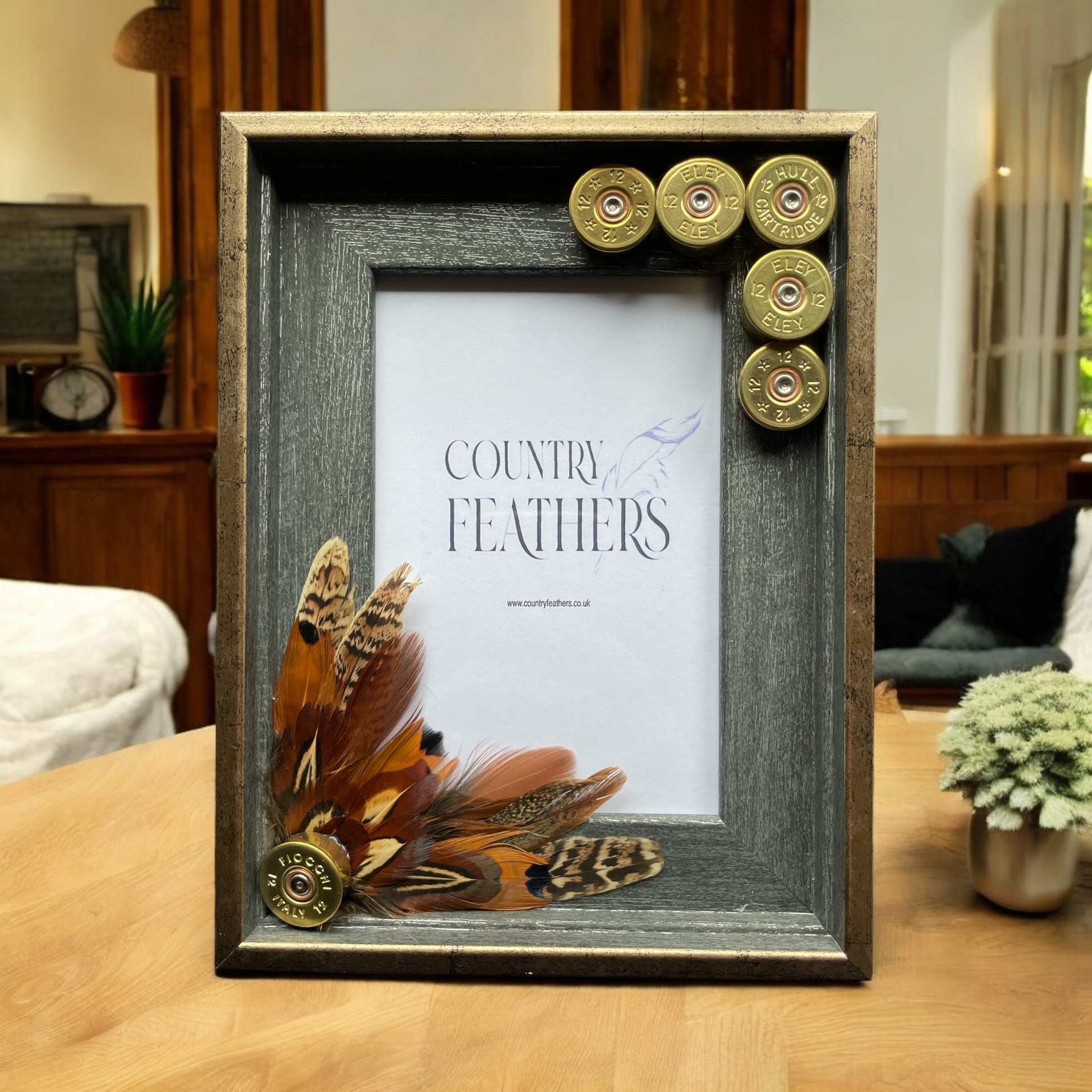 A rustic grey wood effect frame with a subtle metallic gold edging decorated in a recycled polished cartridge heads with pheasant feathers. The country inspired frame fits a single 6x4 inch photo and can be wall hung or stood to suit your space.