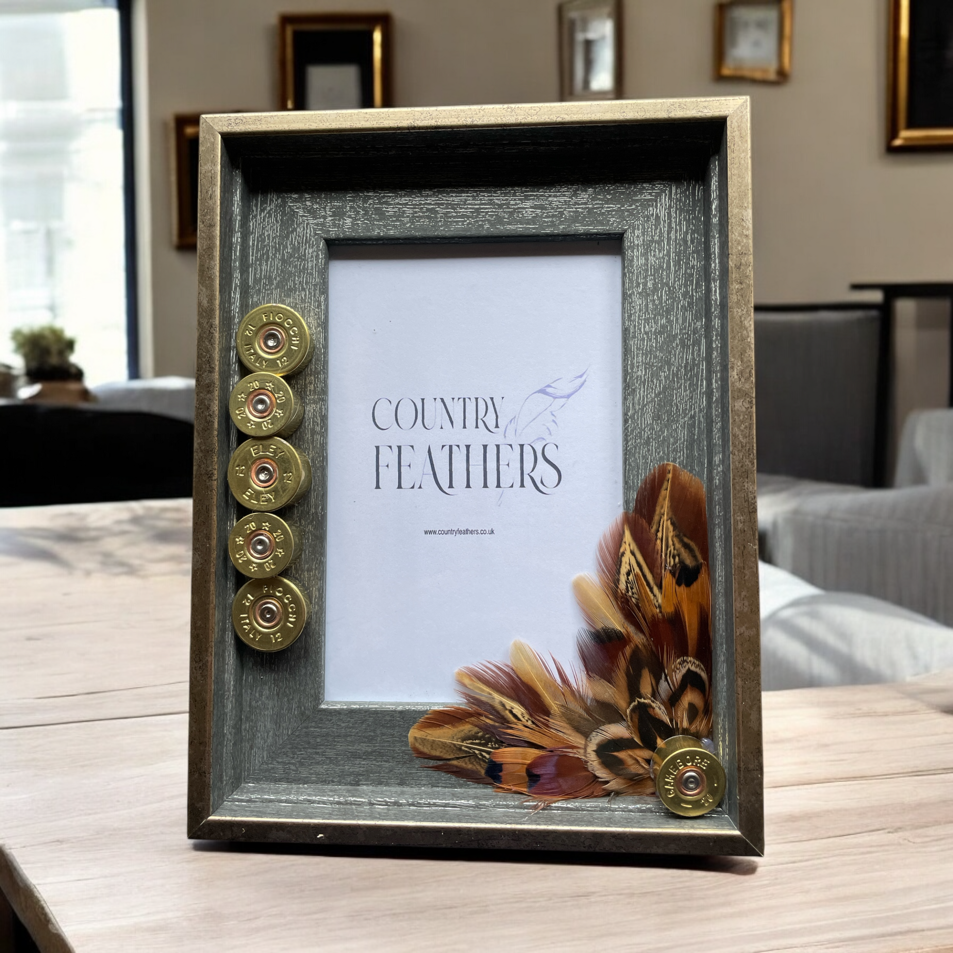 A rustic grey wood effect frame with a subtle metallic gold edging decorated in a recycled polished cartridge heads with pheasant feathers. The country inspired frame fits a single 6x4 inch photo and can be wall hung or stood to suit your space.