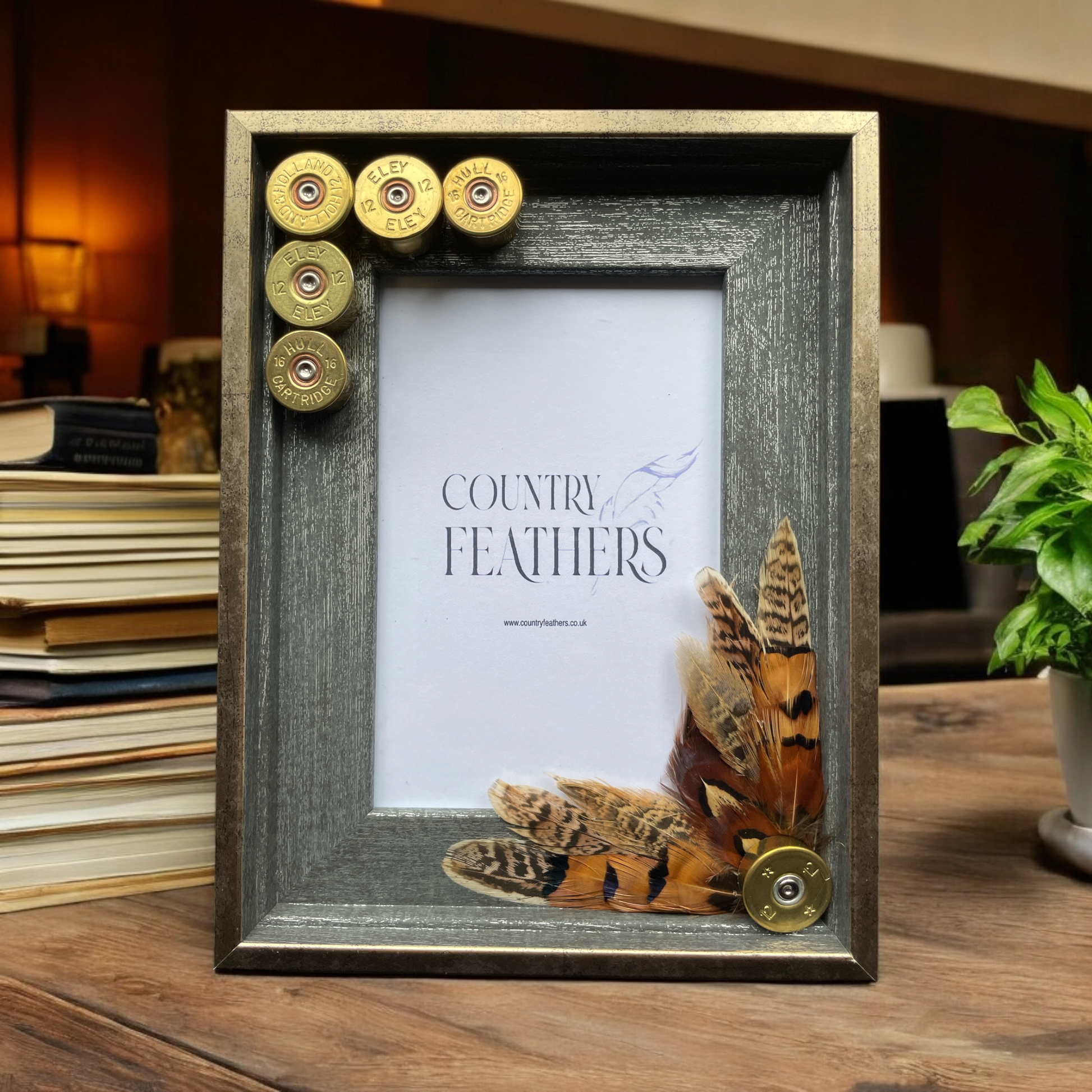 A rustic grey wood effect frame with a subtle metallic gold edging decorated in a recycled polished cartridge heads with pheasant feathers. The country inspired frame fits a single 6x4 inch photo and can be wall hung or stood to suit your space.