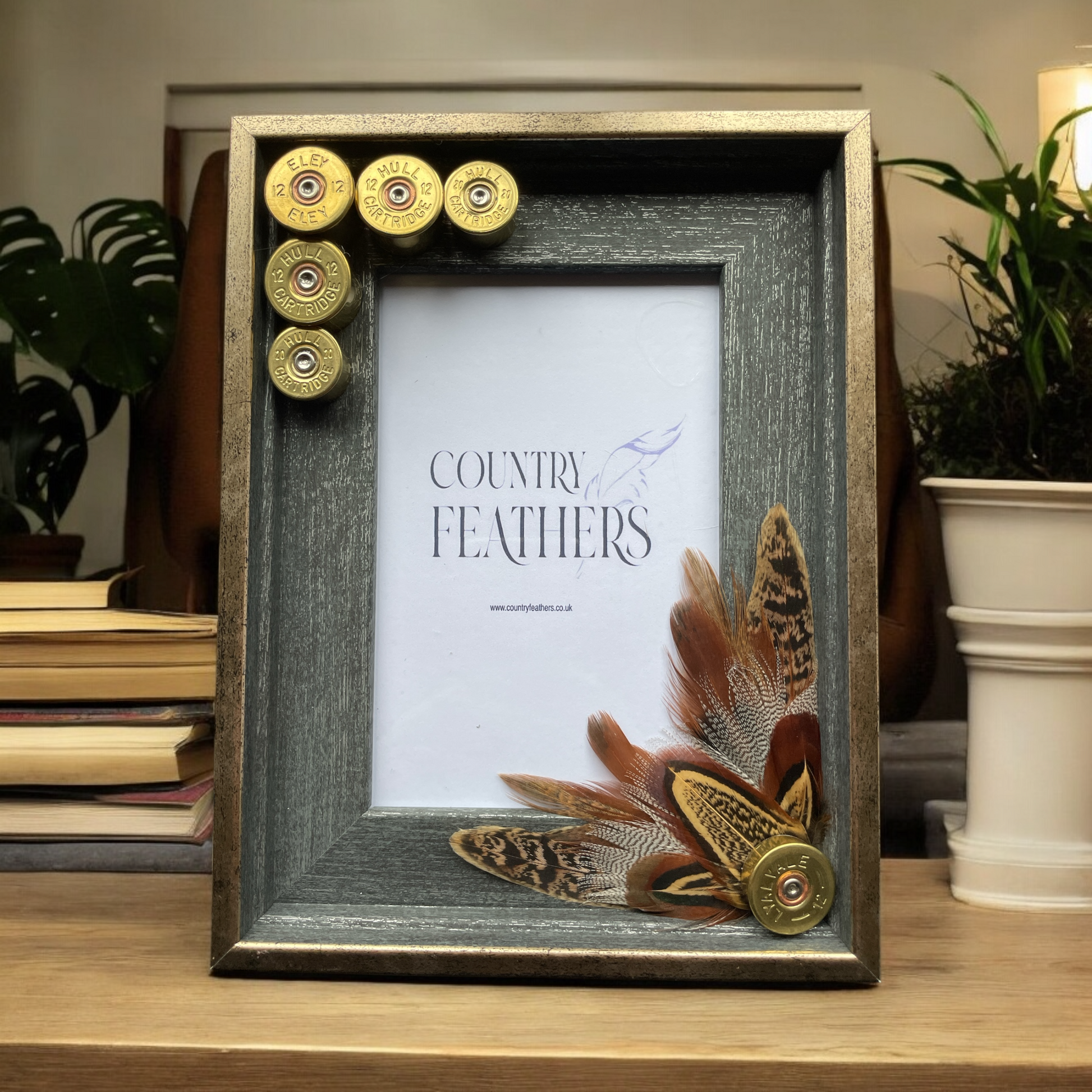 A rustic grey wood effect frame with a subtle metallic gold edging decorated in a recycled polished cartridge heads with pheasant and duck feathers. The country inspired frame fits a single 6x4 inch photo and can be wall hung or stood to suit your space.