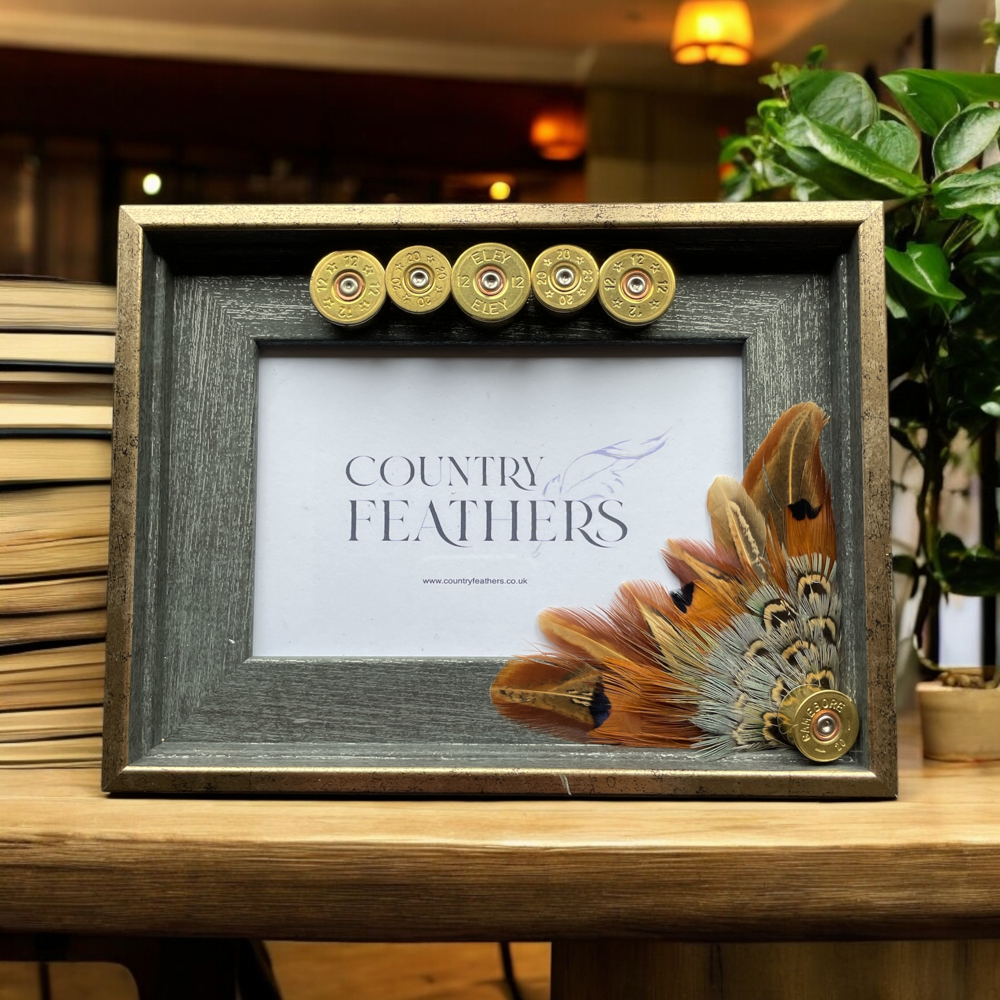 A rustic grey wood effect frame with a subtle metallic gold edging decorated in a recycled polished cartridge heads with pheasant feathers. The country inspired frame fits a single 6x4 inch photo and can be wall hung or stood to suit your space.