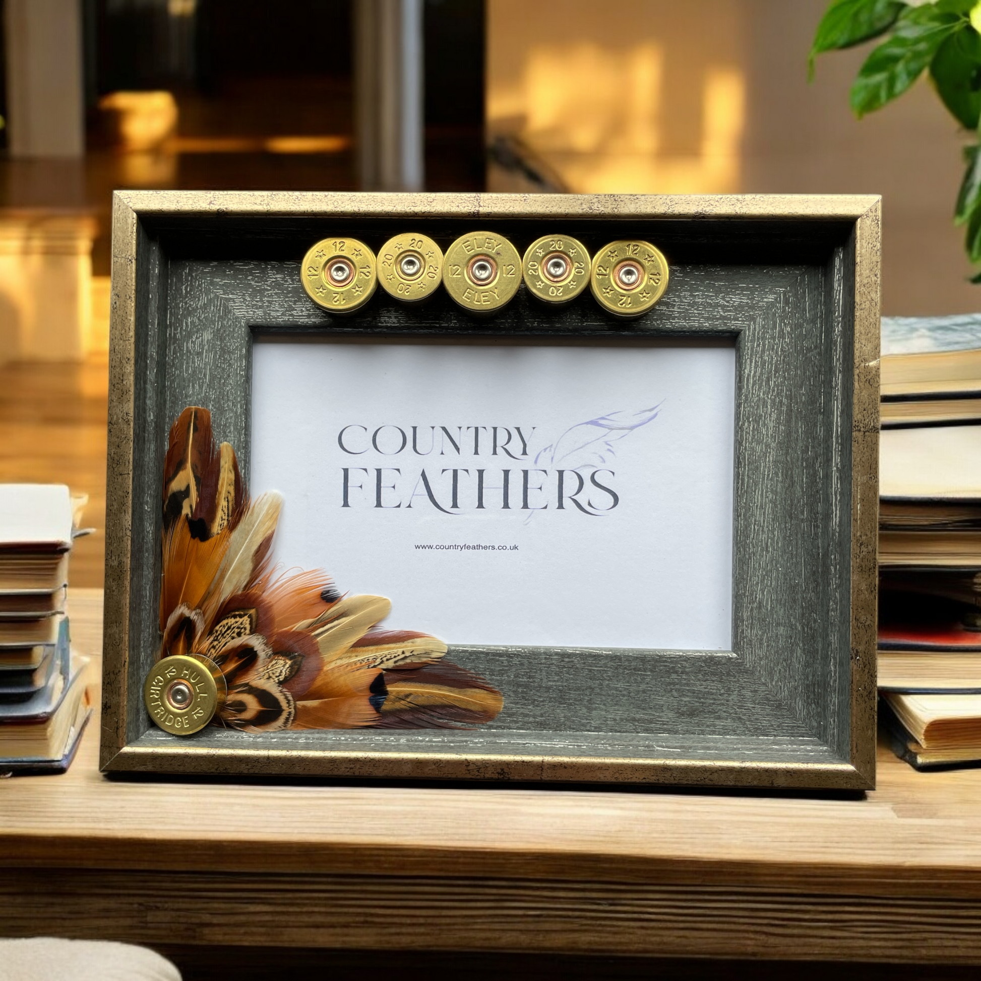 A rustic grey wood effect frame with a subtle metallic gold edging decorated in a recycled polished cartridge heads with pheasant feathers. The country inspired frame fits a single 6x4 inch photo and can be wall hung or stood to suit your space.