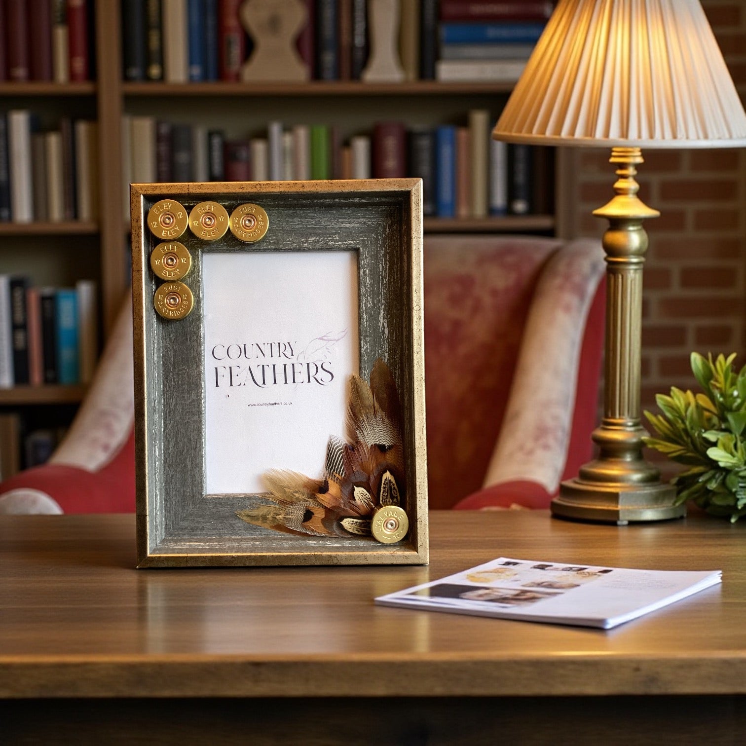A rustic grey wood effect frame with a subtle metallic gold edging decorated in a recycled polished cartridge heads with pheasant and duck feathers. The country inspired frame fits a single 6x4 inch photo and can be wall hung or stood to suit your space.