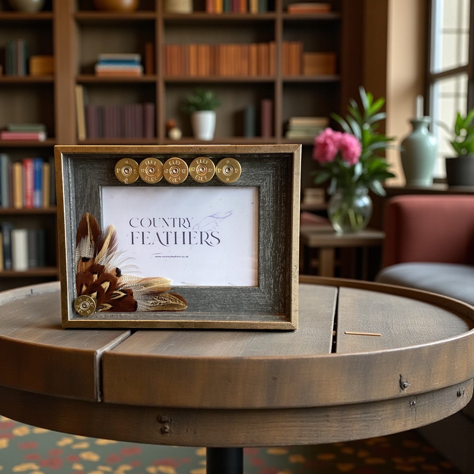 A rustic grey wood effect frame with a subtle metallic gold edging decorated in a recycled polished cartridge heads with pheasant and duck feathers. The country inspired frame fits a single 6x4 inch photo and can be wall hung or stood to suit your space.
