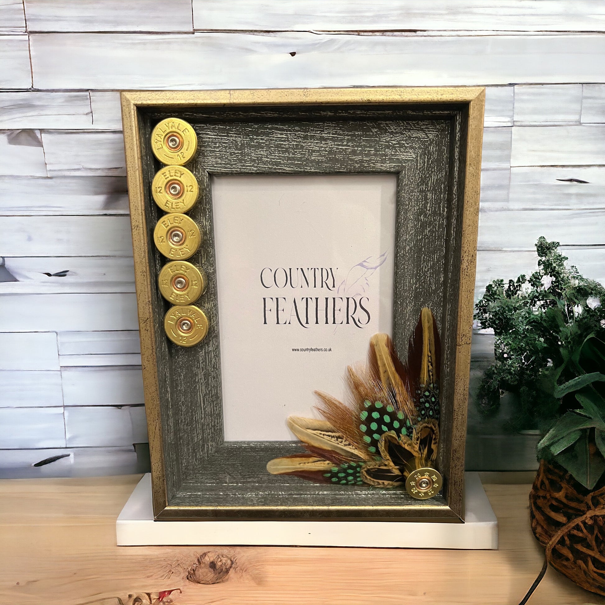 A rustic grey wood effect frame with a subtle metallic gold edging decorated in a recycled polished cartridge heads with pheasant and green dyed guinea fowl feathers. The country inspired frame fits a single 6x4 inch photo and can be wall hung or stood to suit your space.