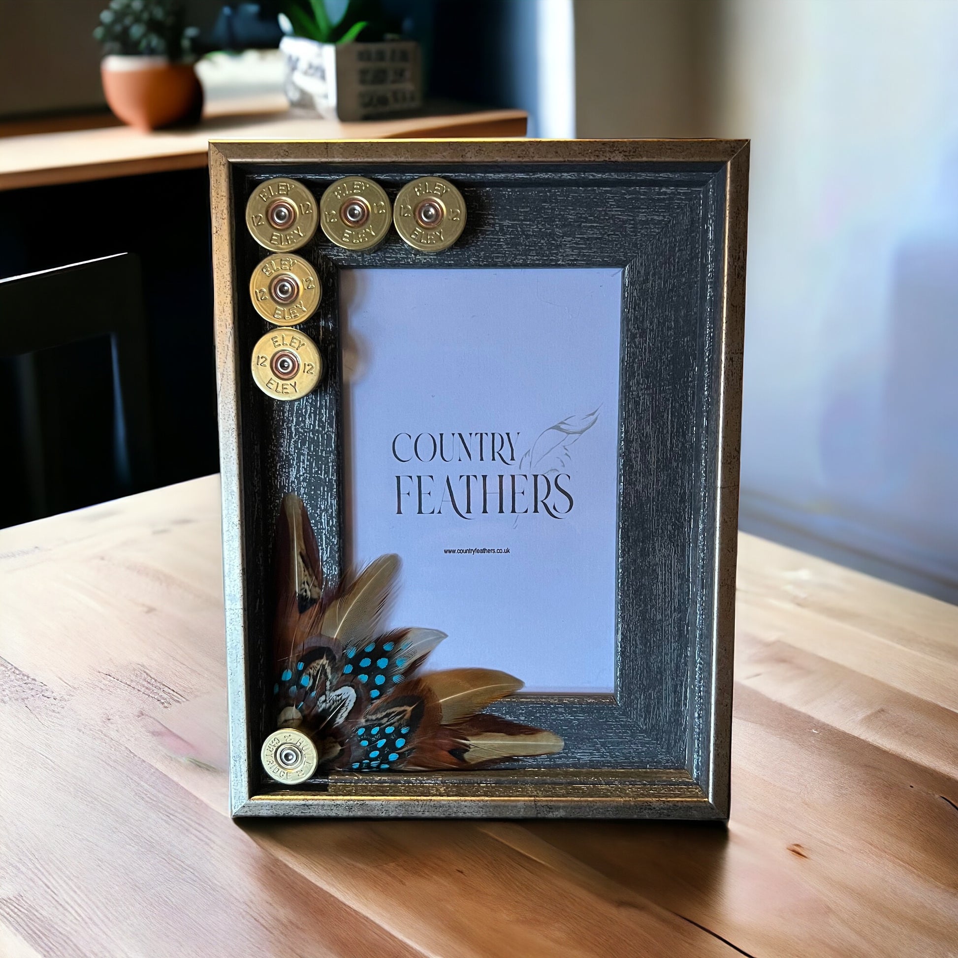 A rustic grey wood effect frame with a subtle metallic gold edging decorated in a recycled polished cartridge heads with pheasant, and turquoise dyed guinea fowl feathers. The country inspired frame fits a single 6x4 inch photo and can be wall hung or stood to suit your space.
