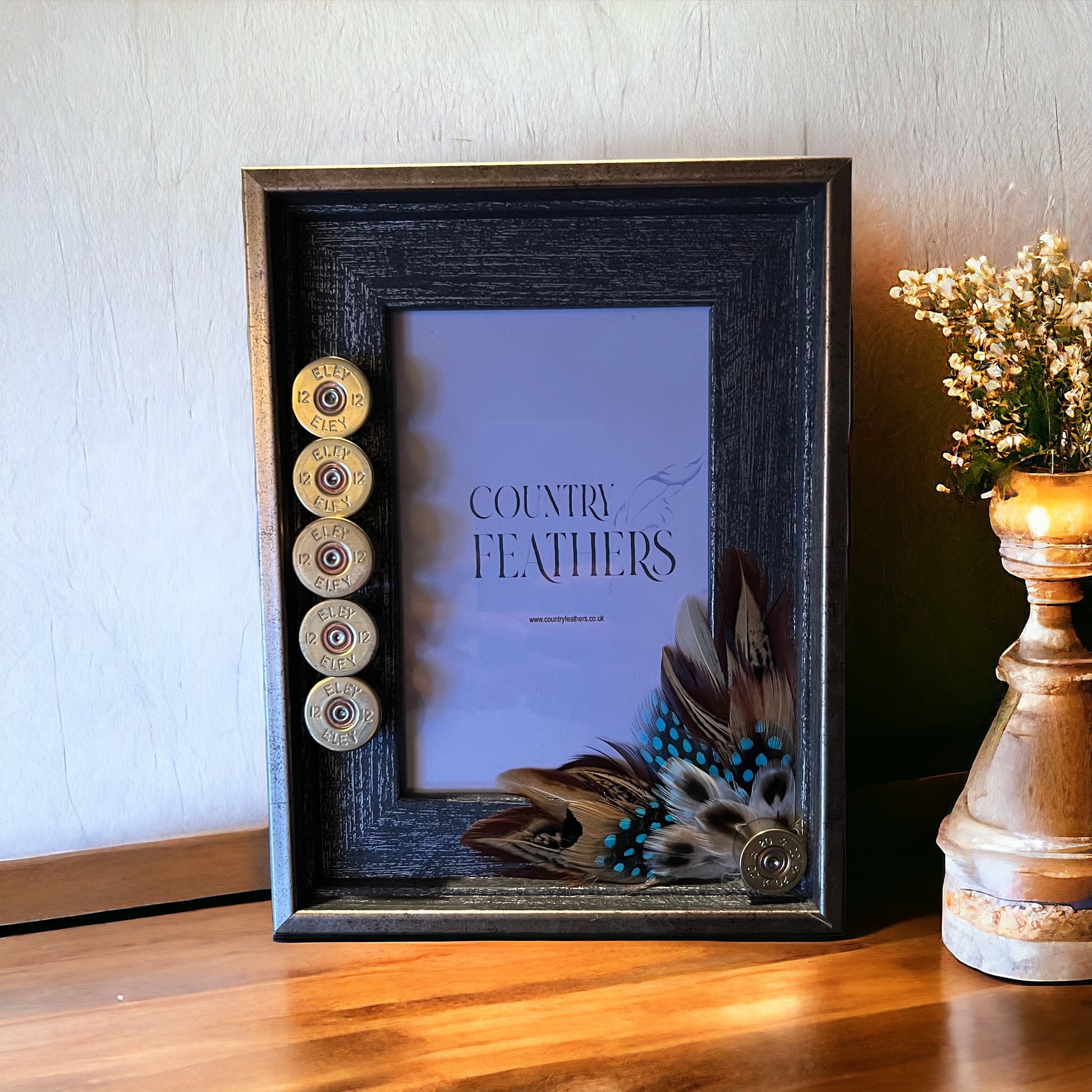 A rustic grey wood effect frame with a subtle metallic gold edging decorated in a recycled polished cartridge heads with pheasant, and turquoise dyed guinea fowl feathers. The country inspired frame fits a single 6x4 inch photo and can be wall hung or stood to suit your space.